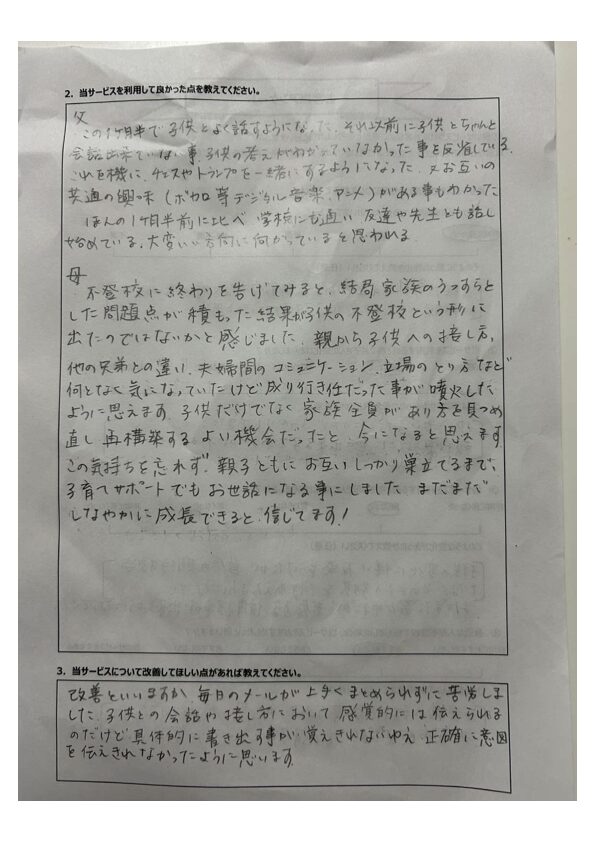 このサポートを通じて、私たちも「親が変われば、子どもも変わる」ということを改めて実感しました。