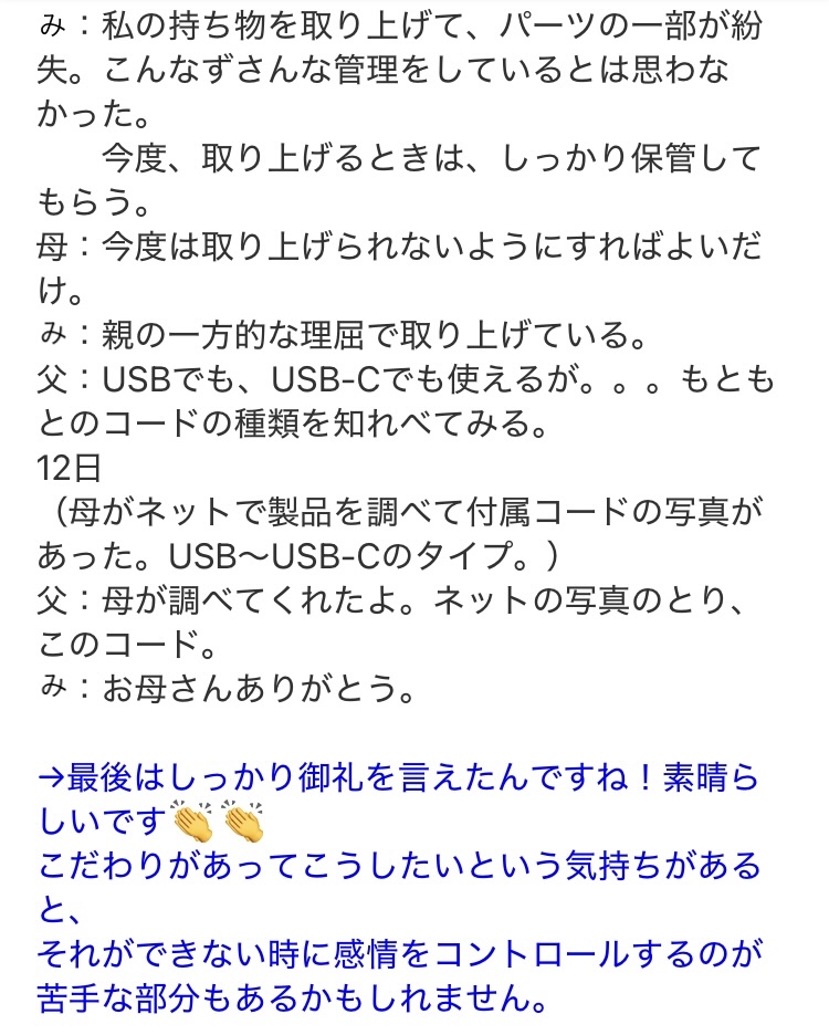 親御さんの毅然とした態度と、共感をもって話を聞く姿勢が、みさきちゃんの心を少しずつ動かしていったように感じます。