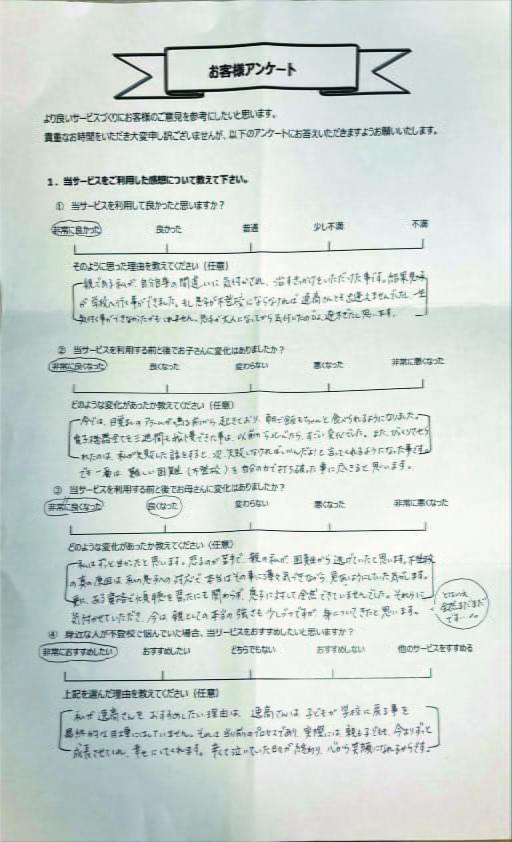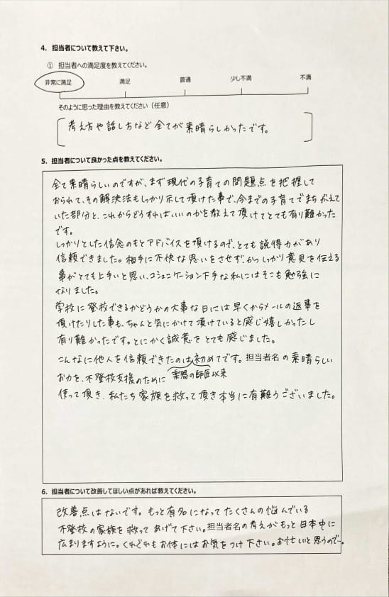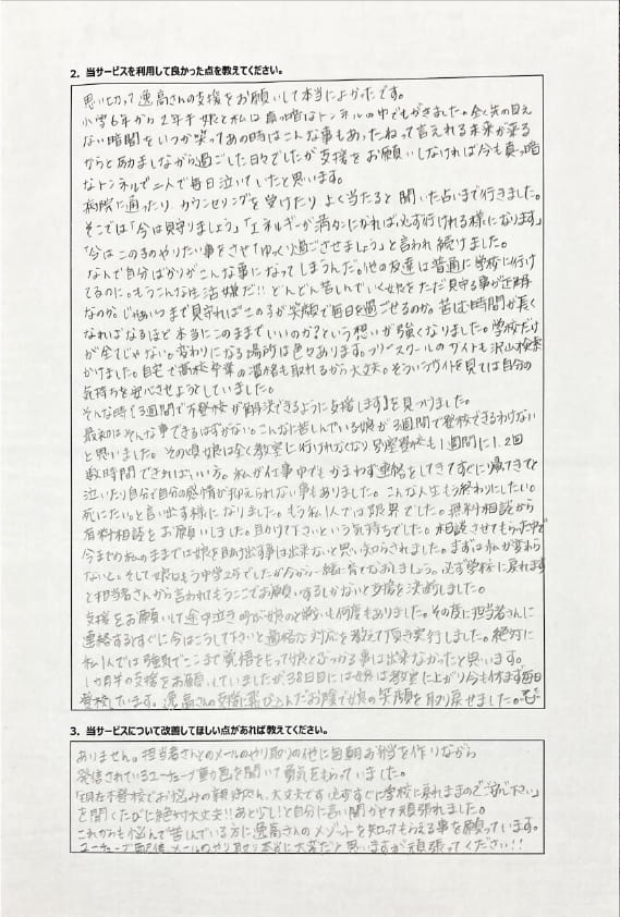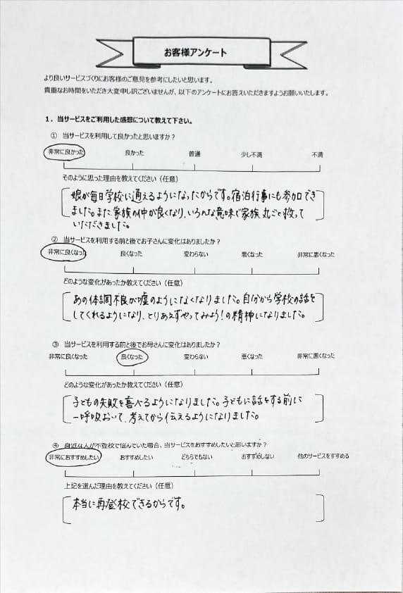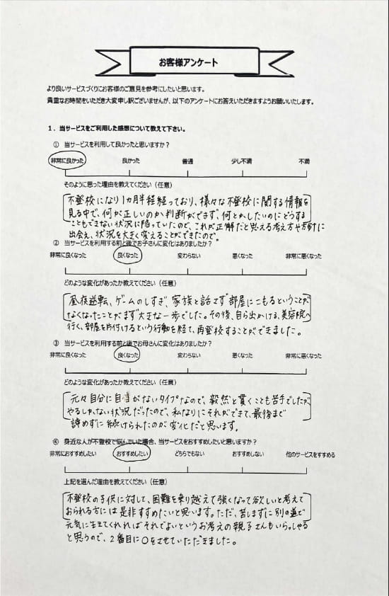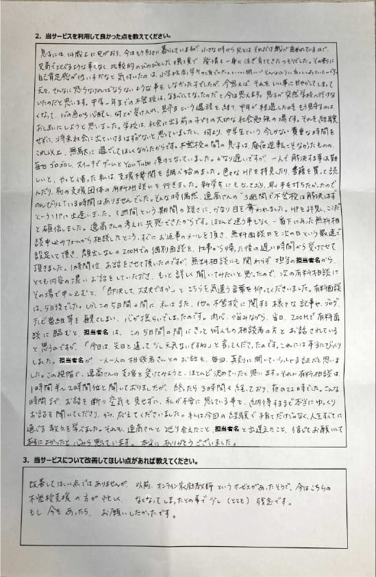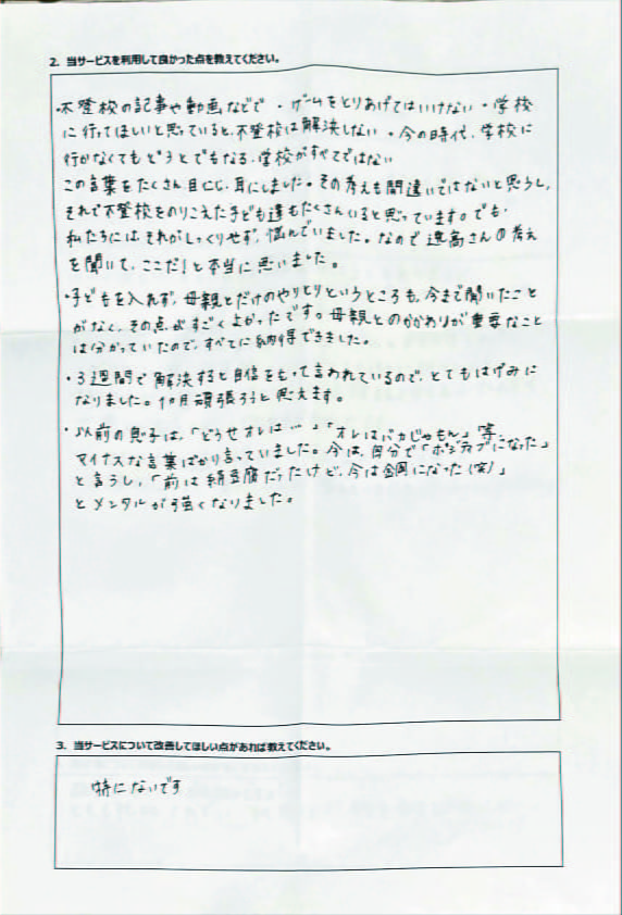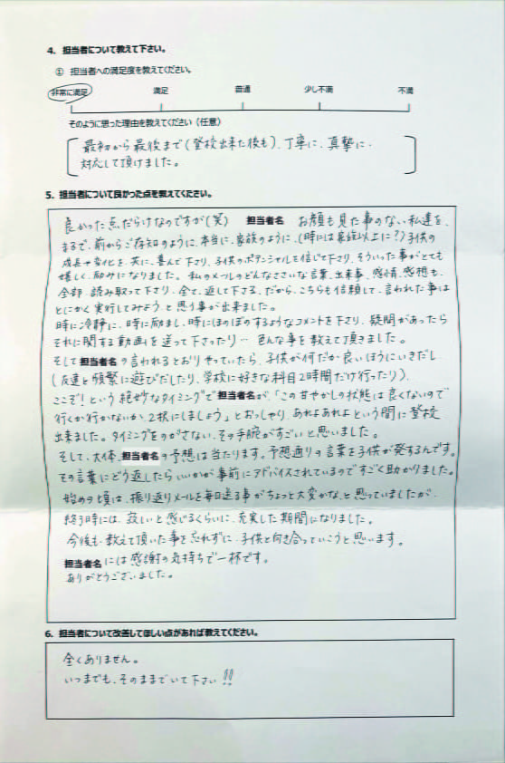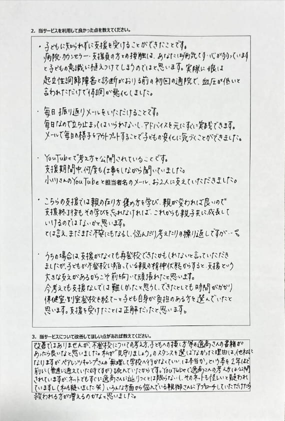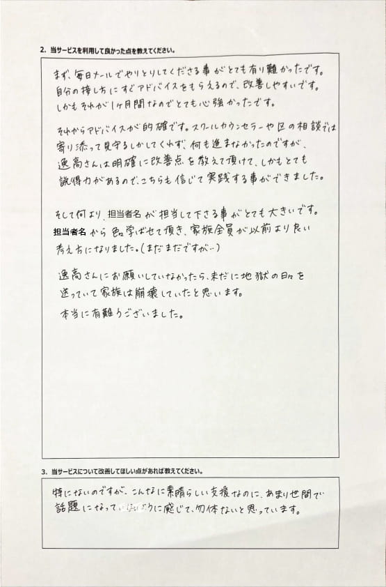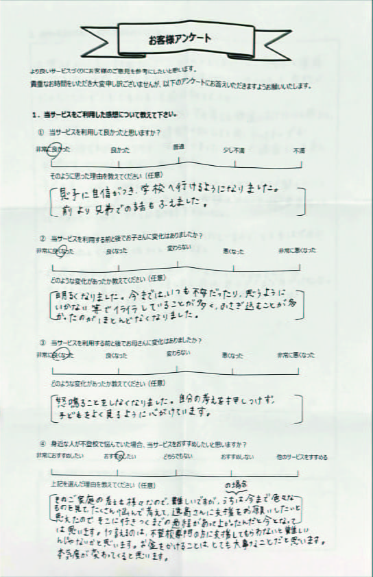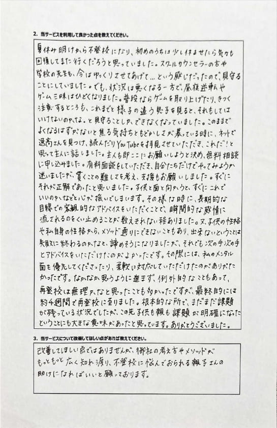 とにかく子どもが再登校できたことがすごかったです。そして、どの相談先よりも具体的なアドバイスがこんなにも出てくることが不思議で仕方なかったです。