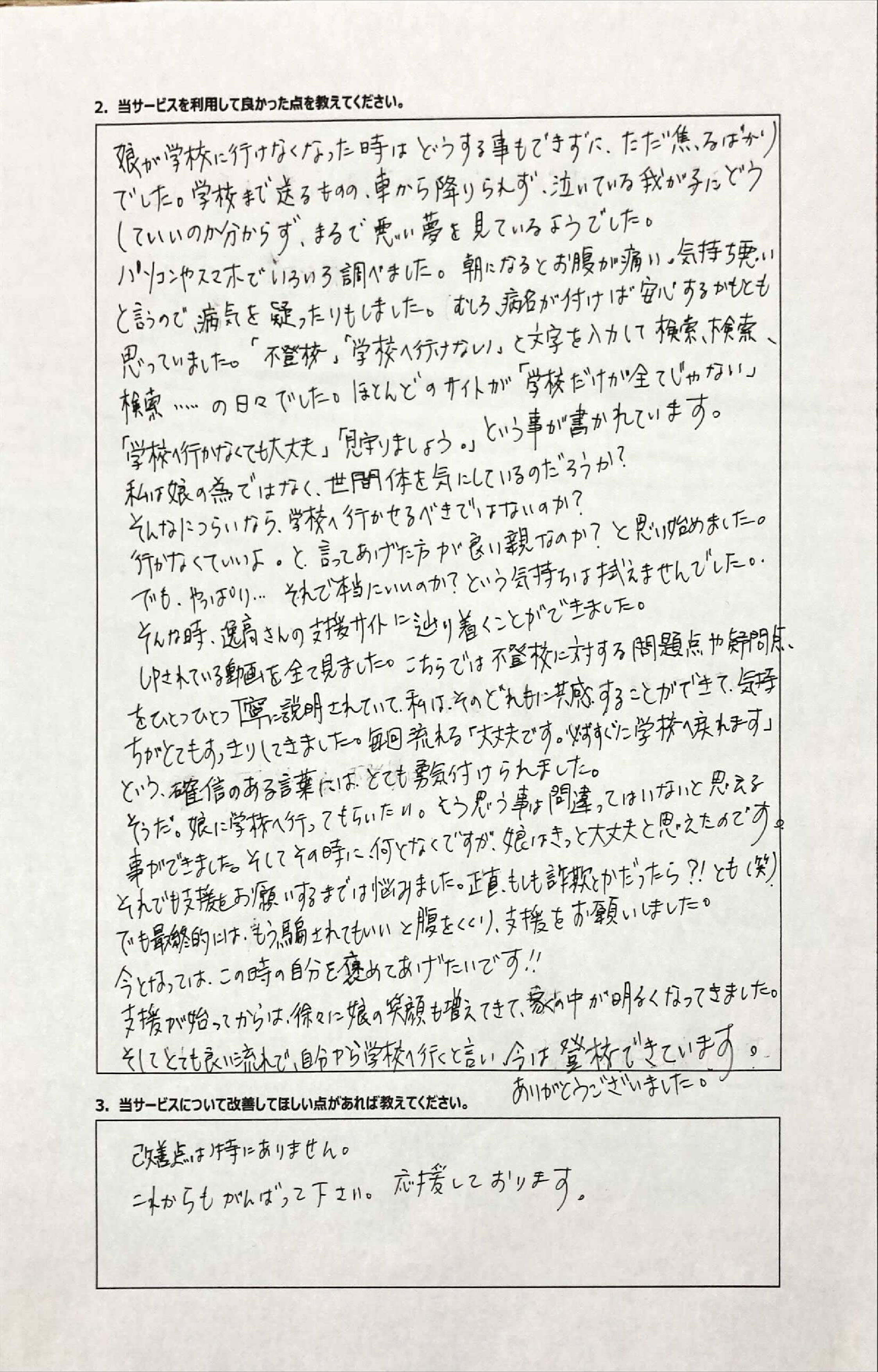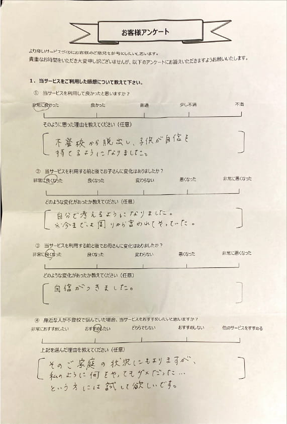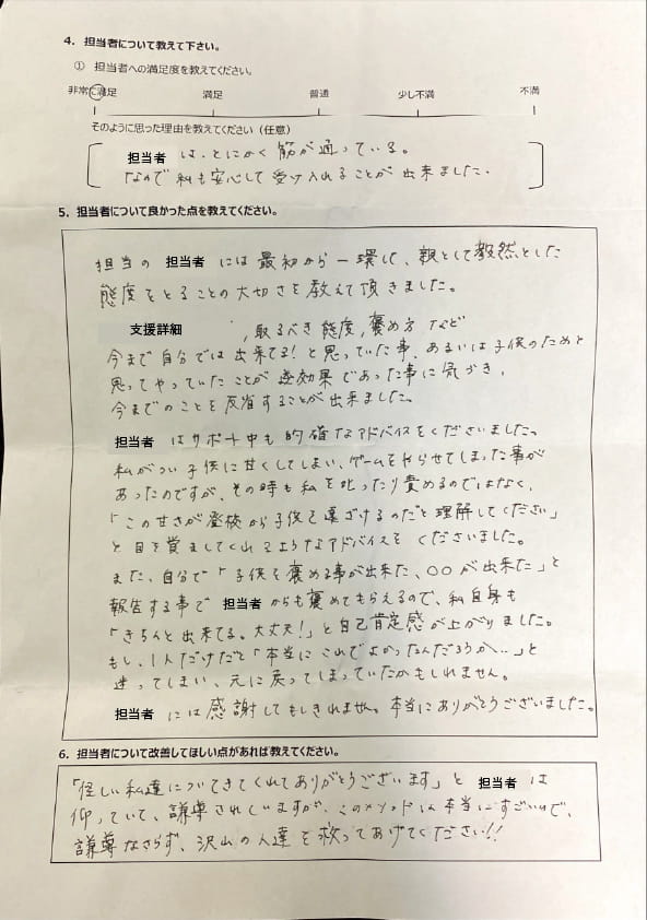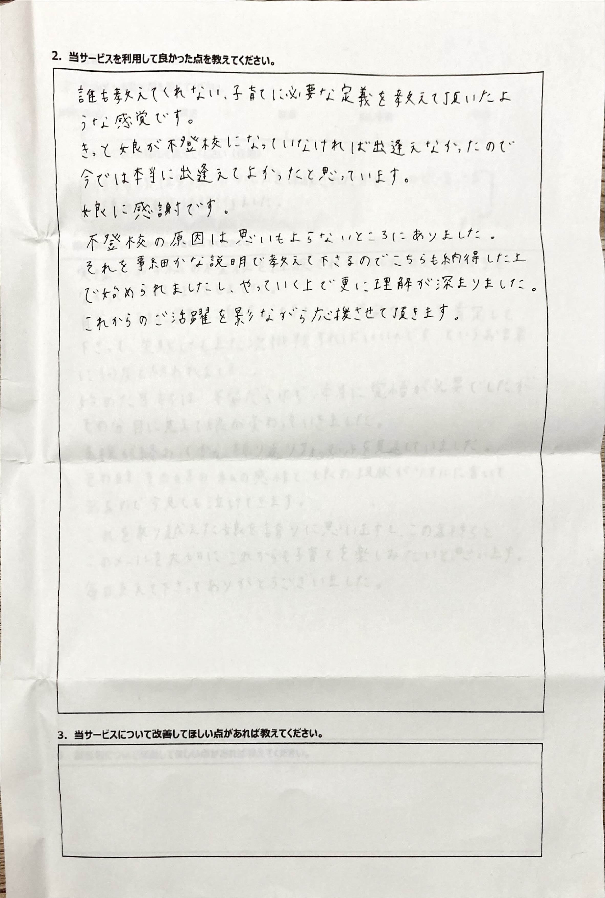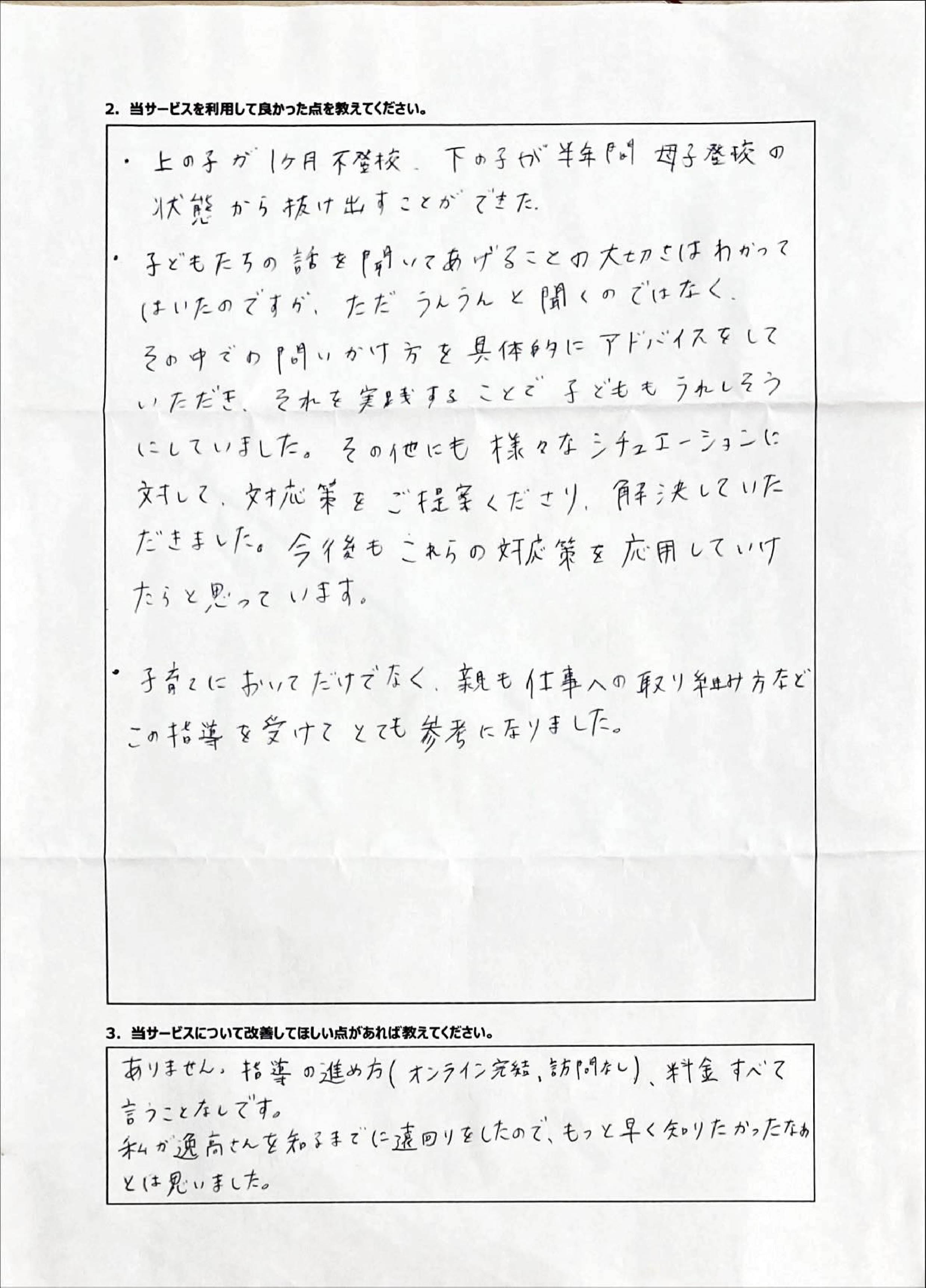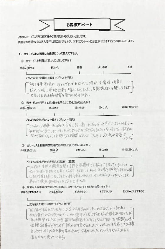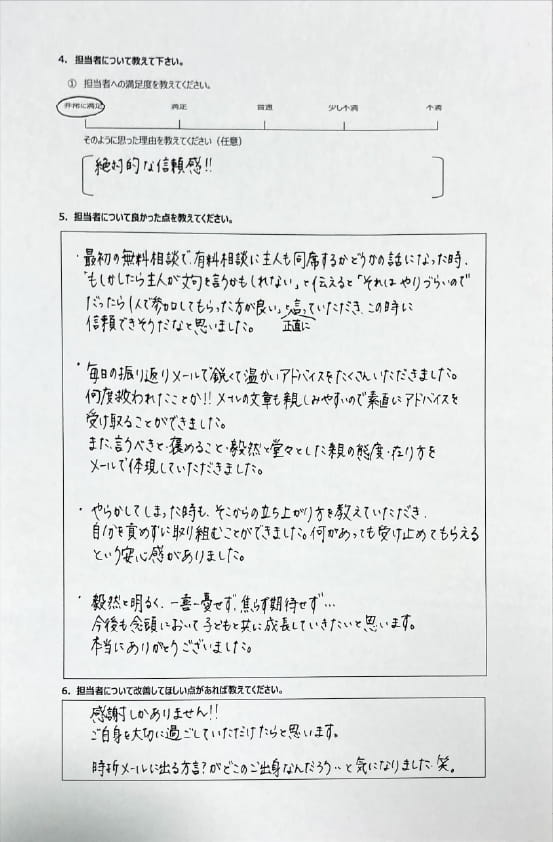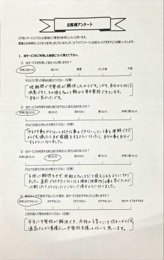 とにかく子どもが再登校できたことがすごかったです。そして、どの相談先よりも具体的なアドバイスがこんなにも出てくることが不思議で仕方なかったです。