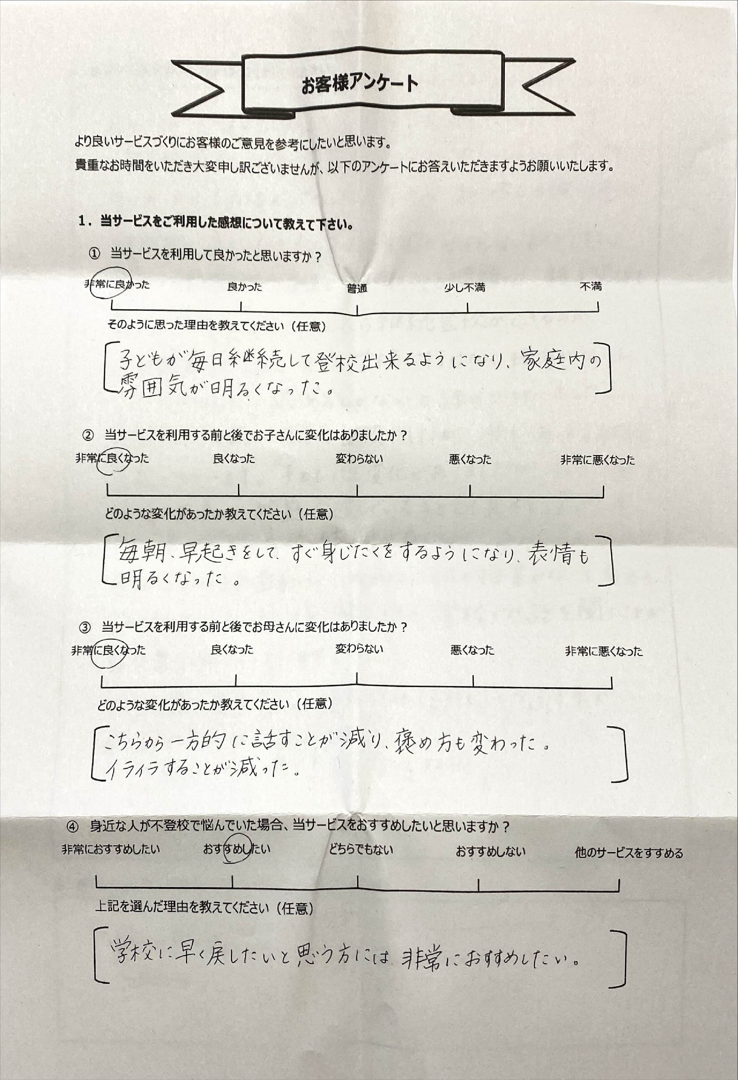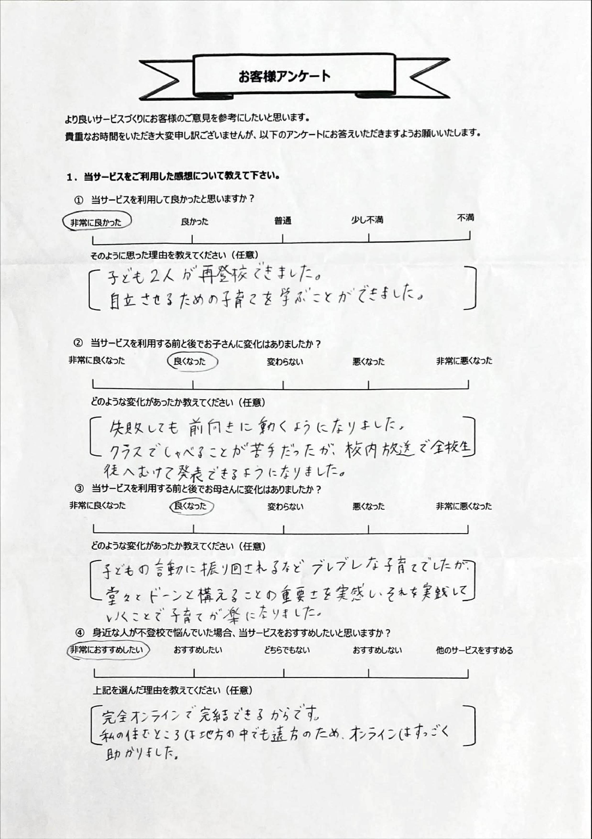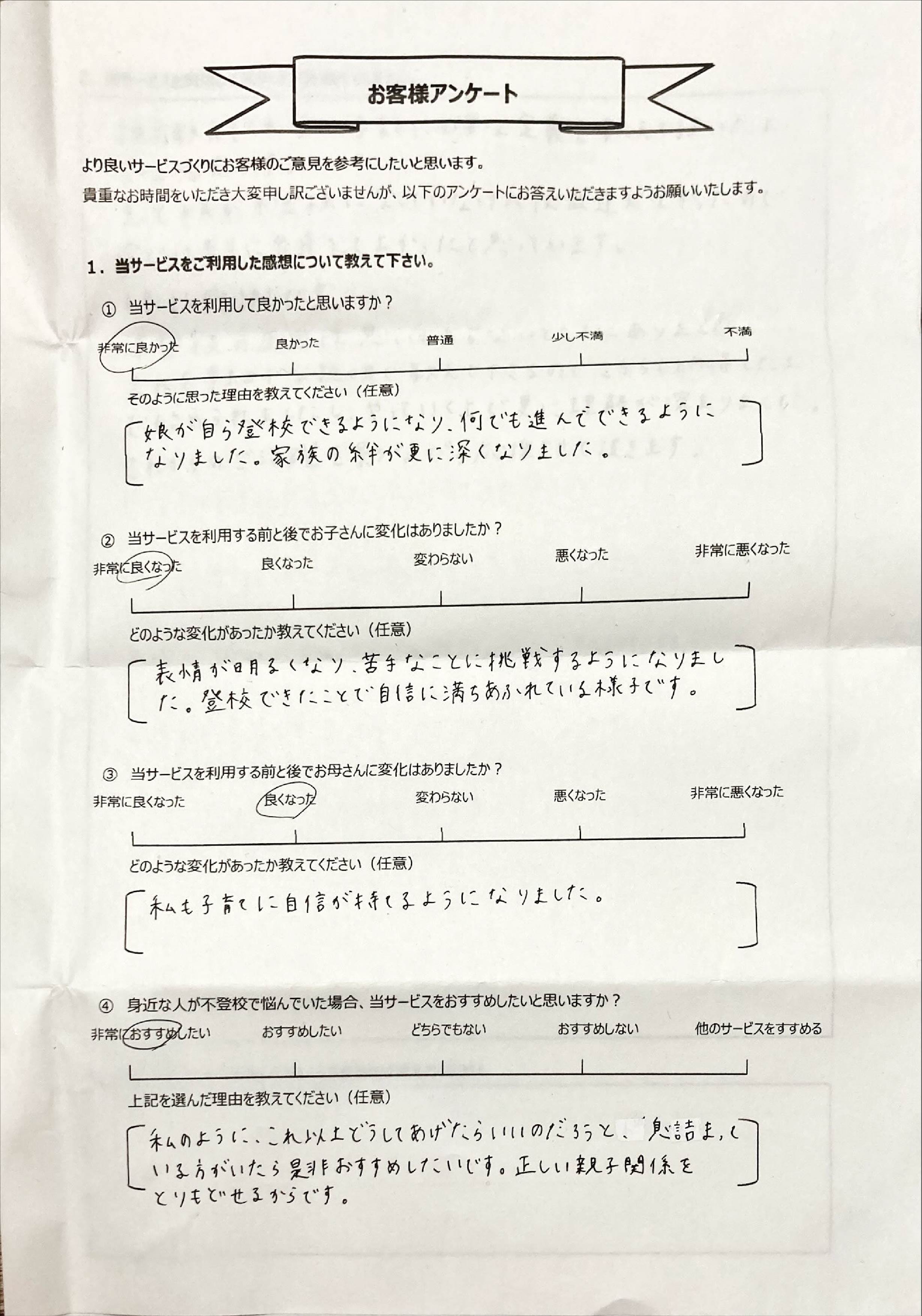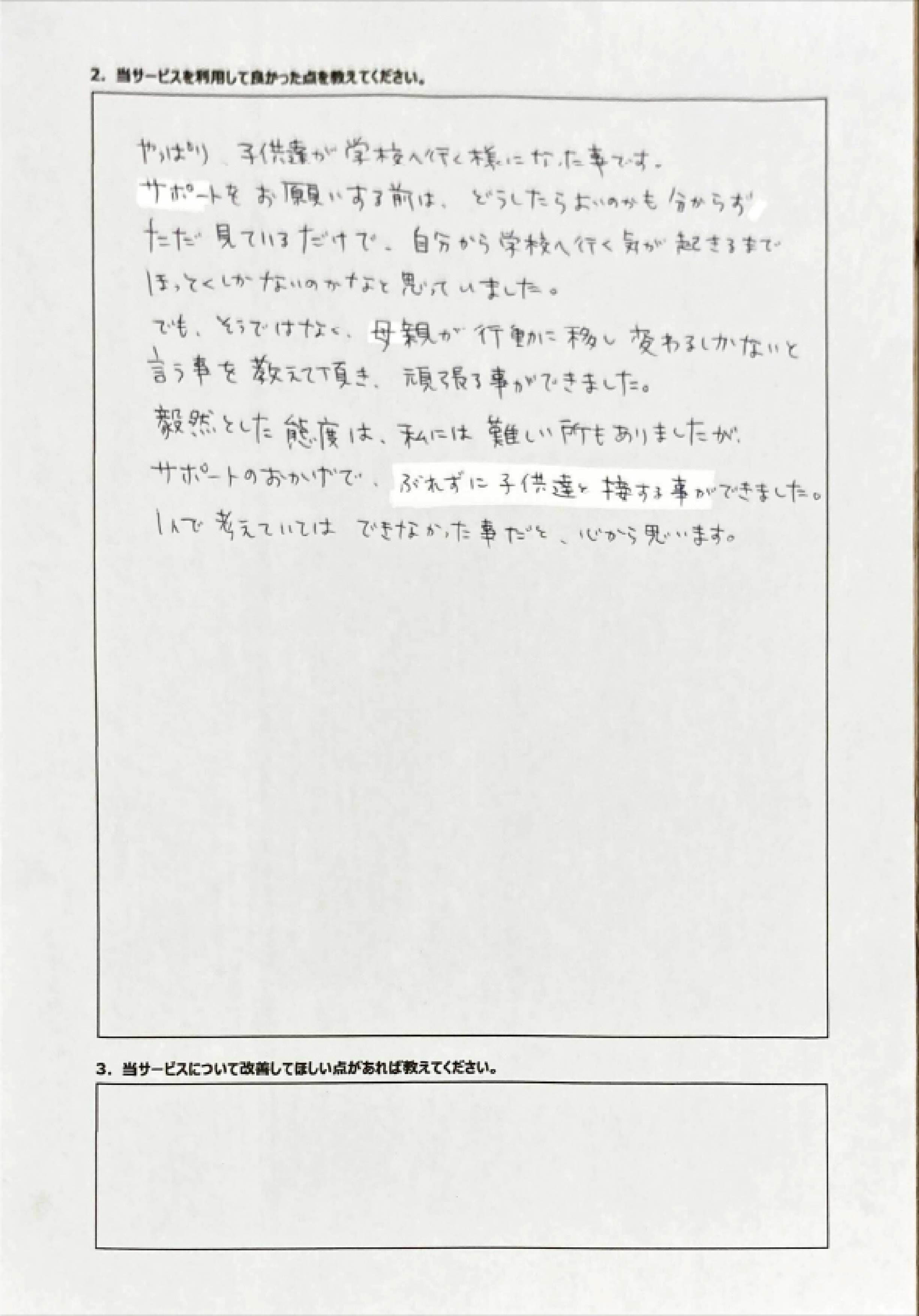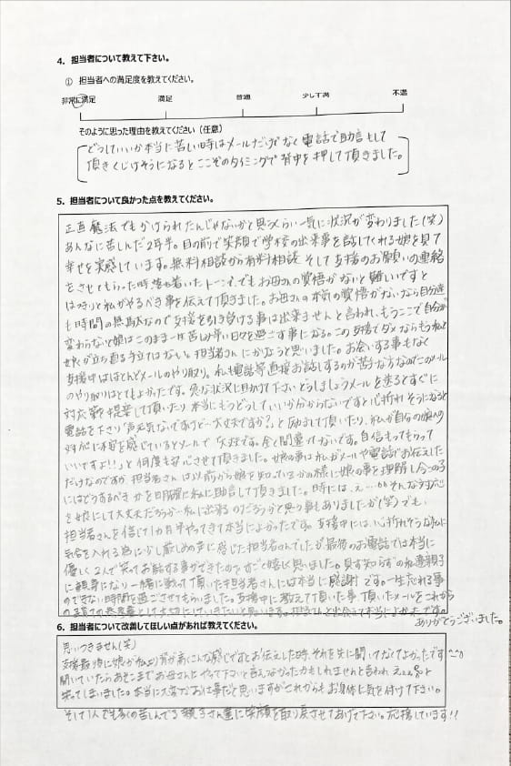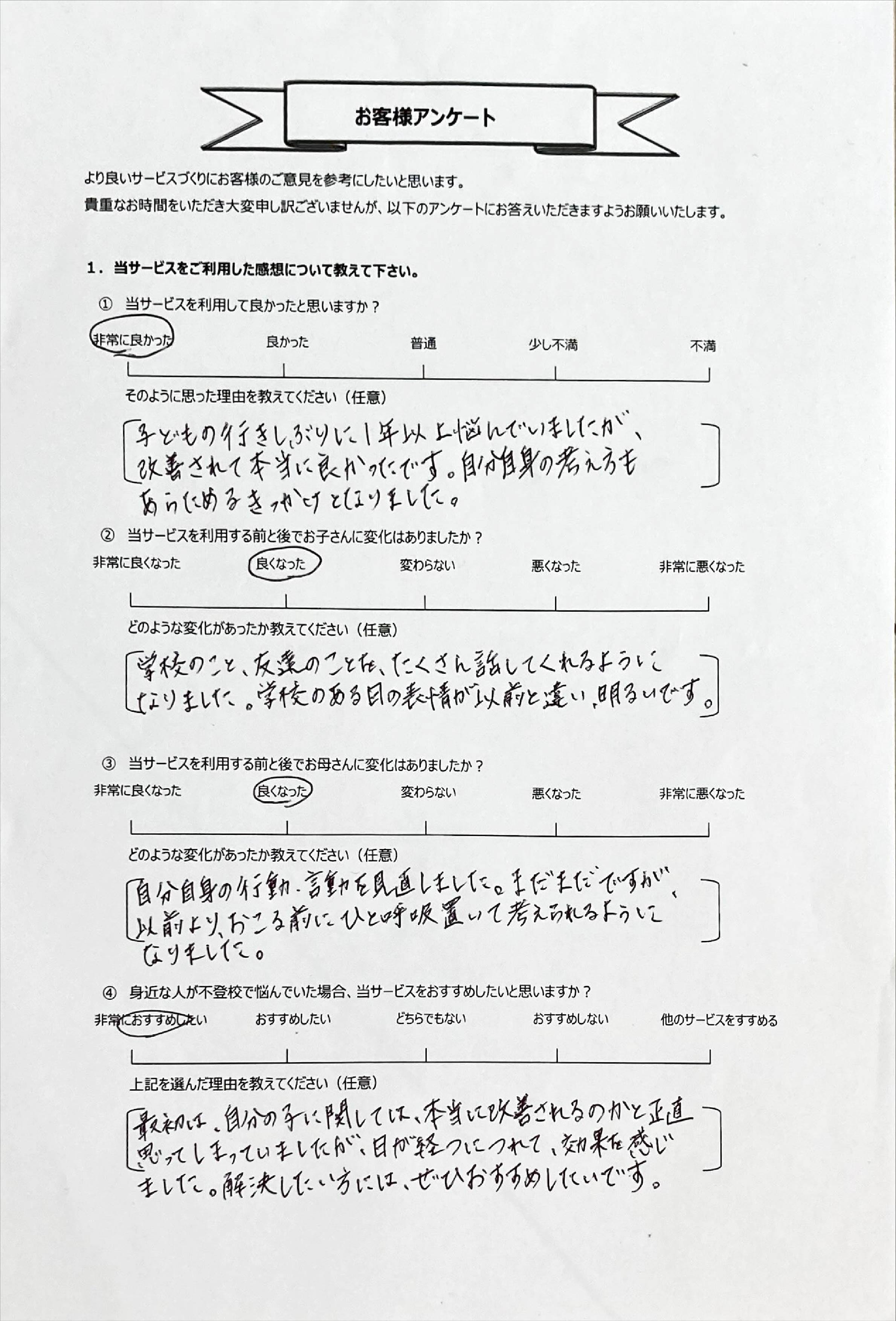 とにかく子どもが再登校できたことがすごかったです。そして、どの相談先よりも具体的なアドバイスがこんなにも出てくることが不思議で仕方なかったです。