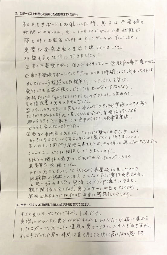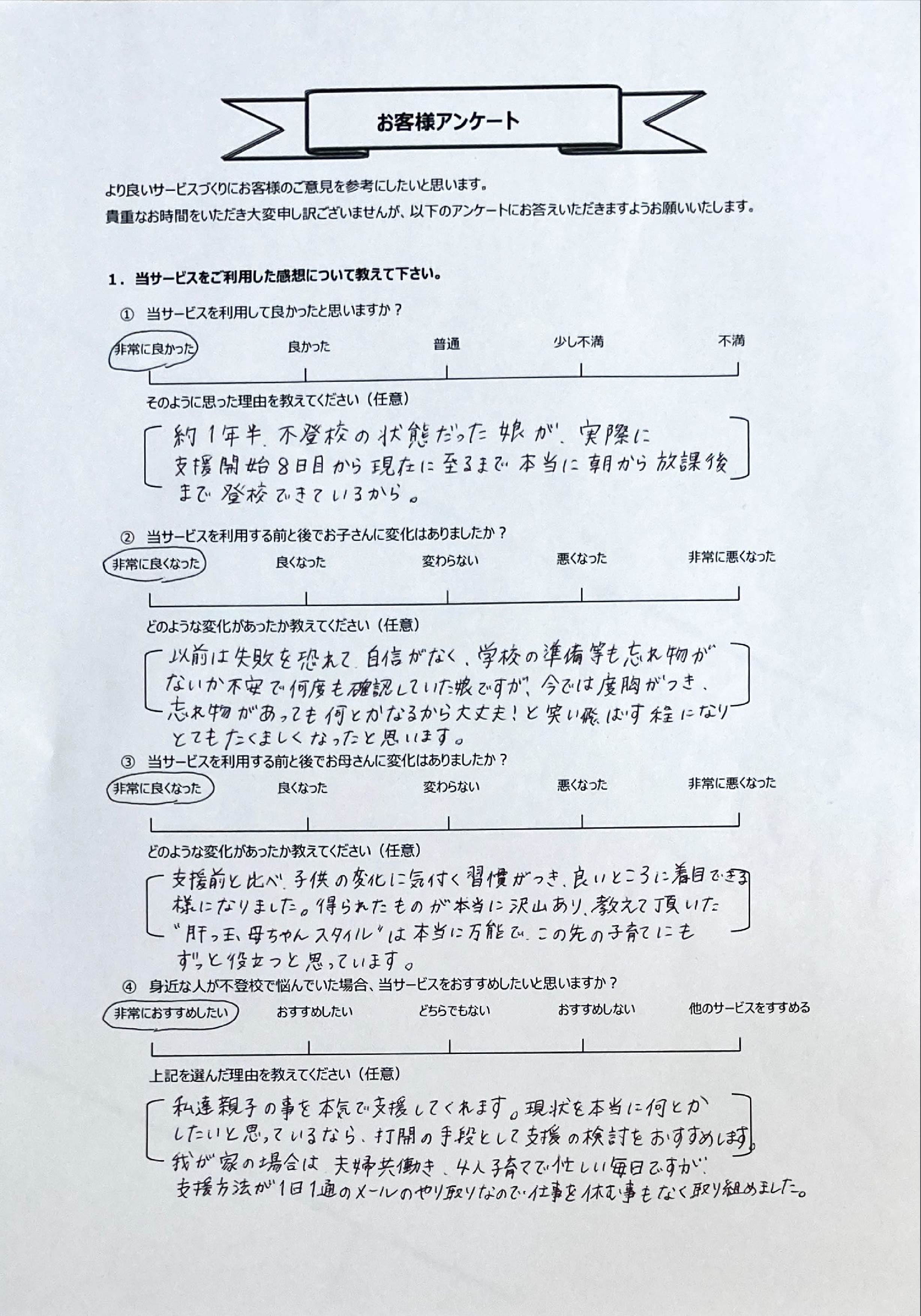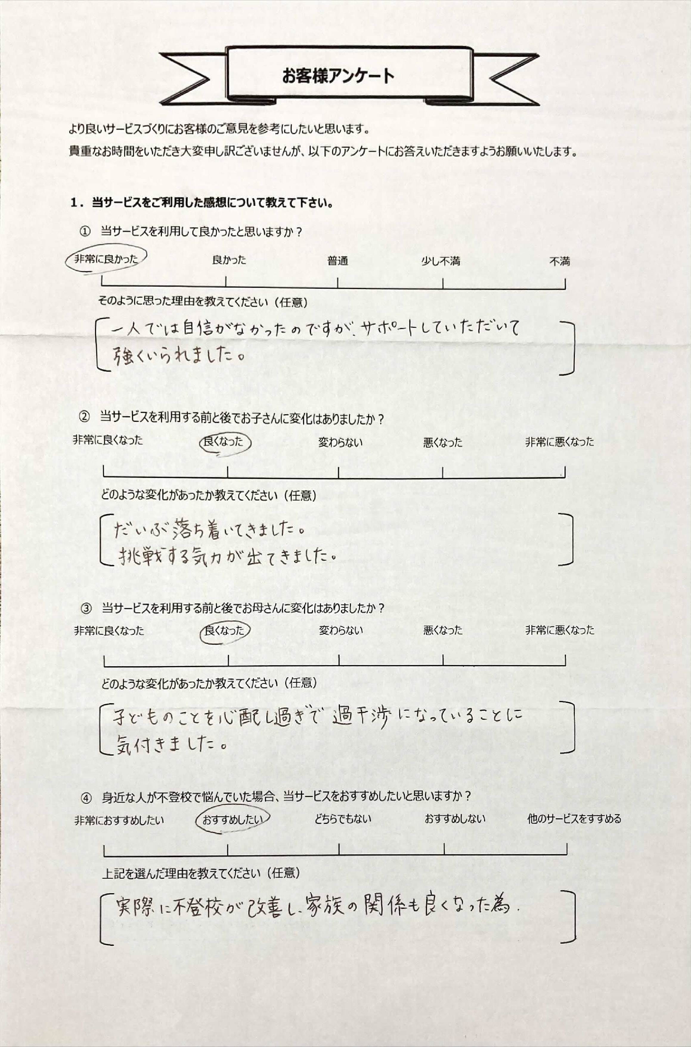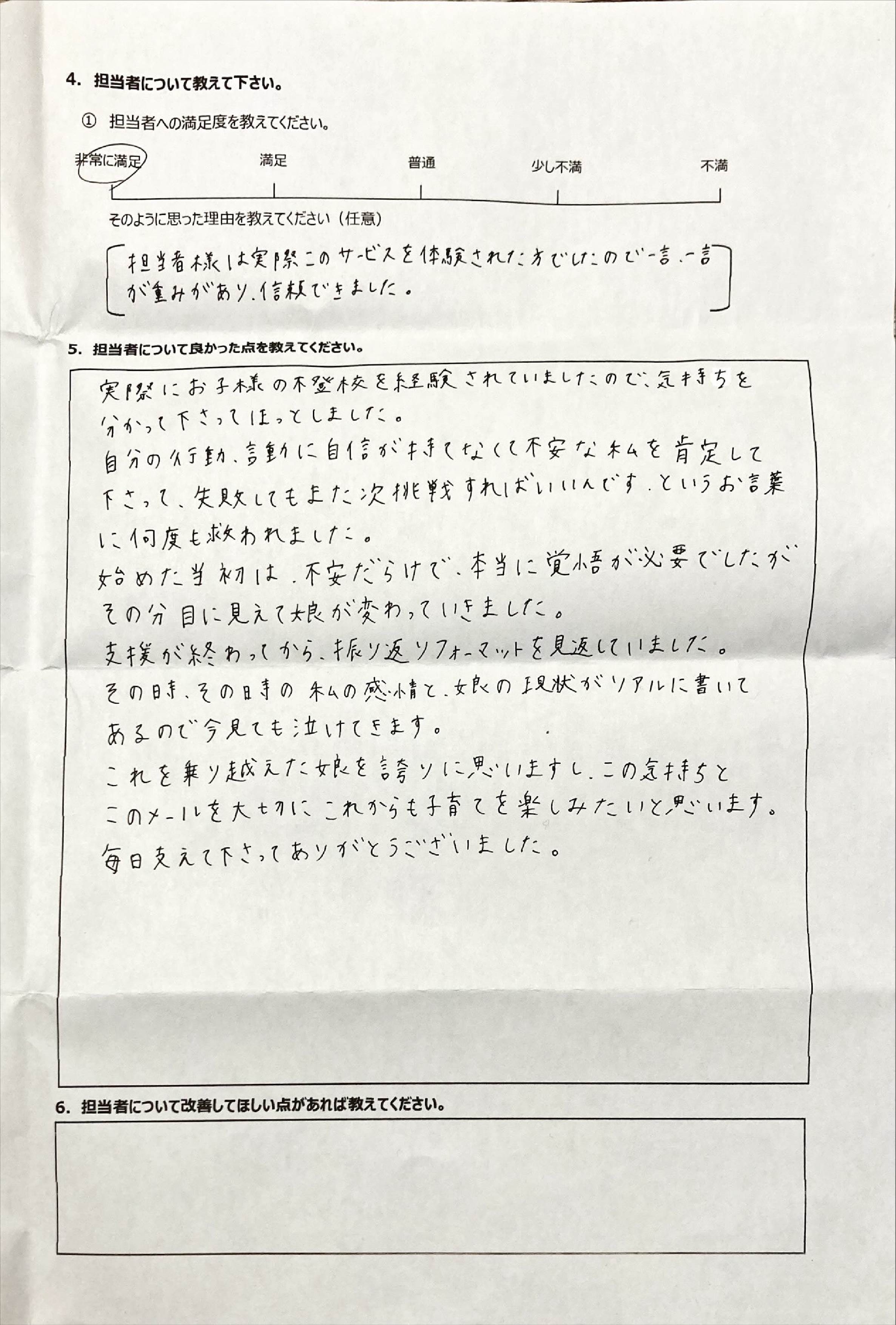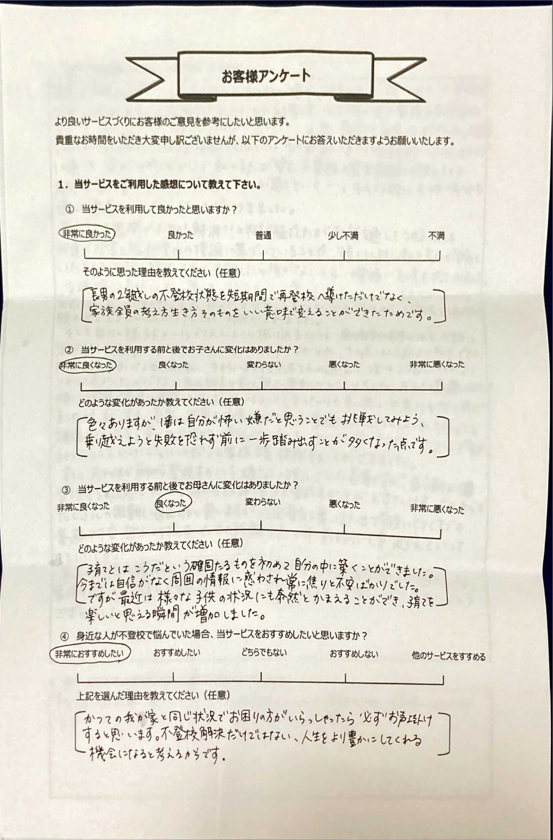 とにかく子どもが再登校できたことがすごかったです。そして、どの相談先よりも具体的なアドバイスがこんなにも出てくることが不思議で仕方なかったです。
