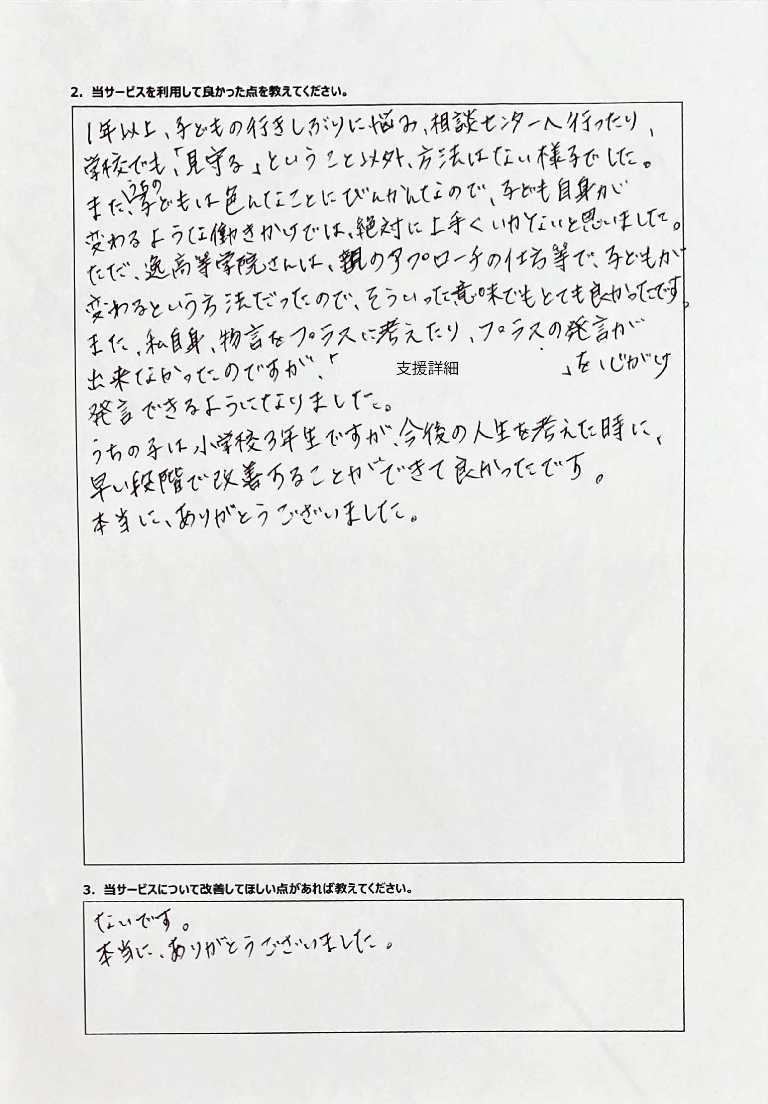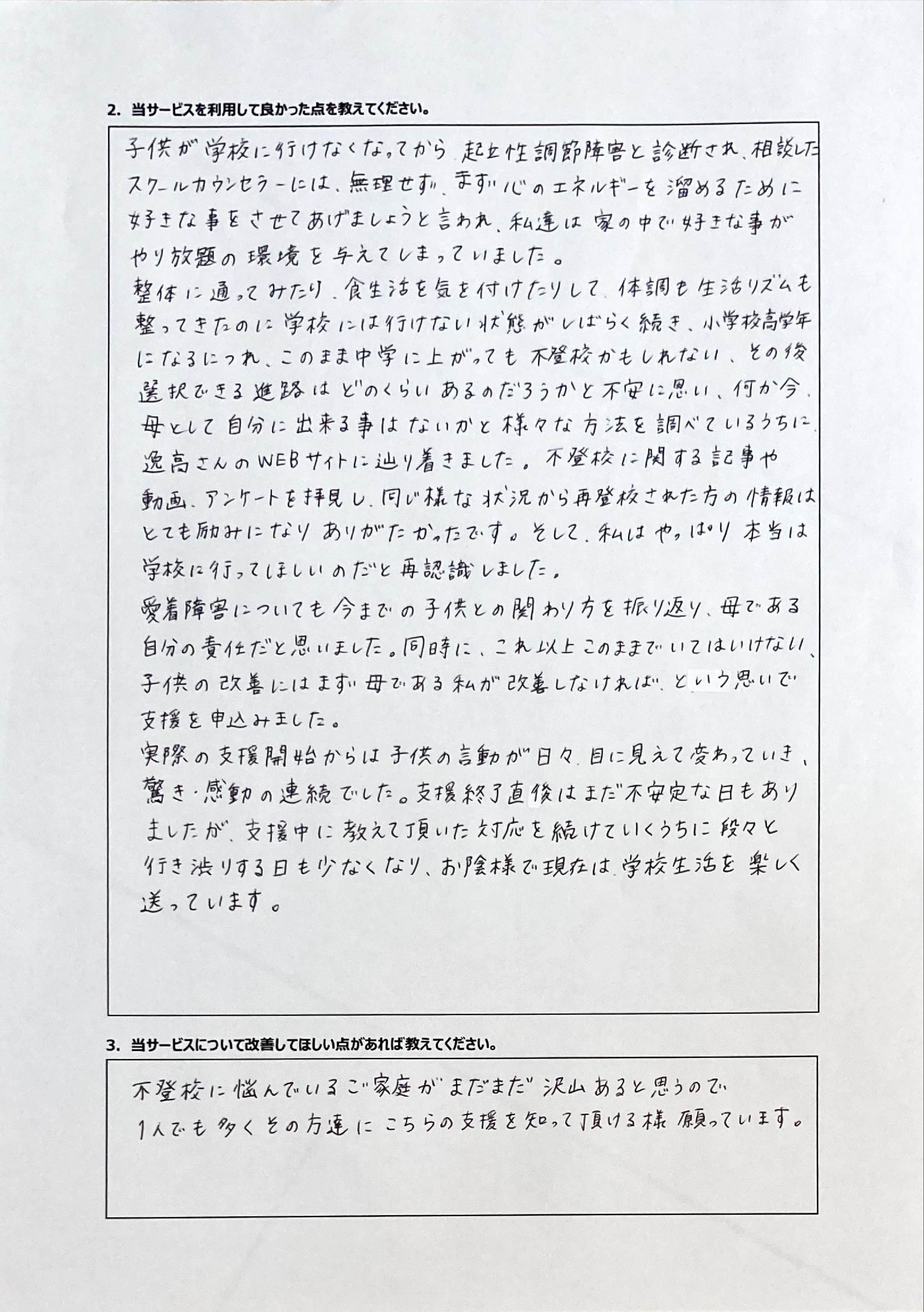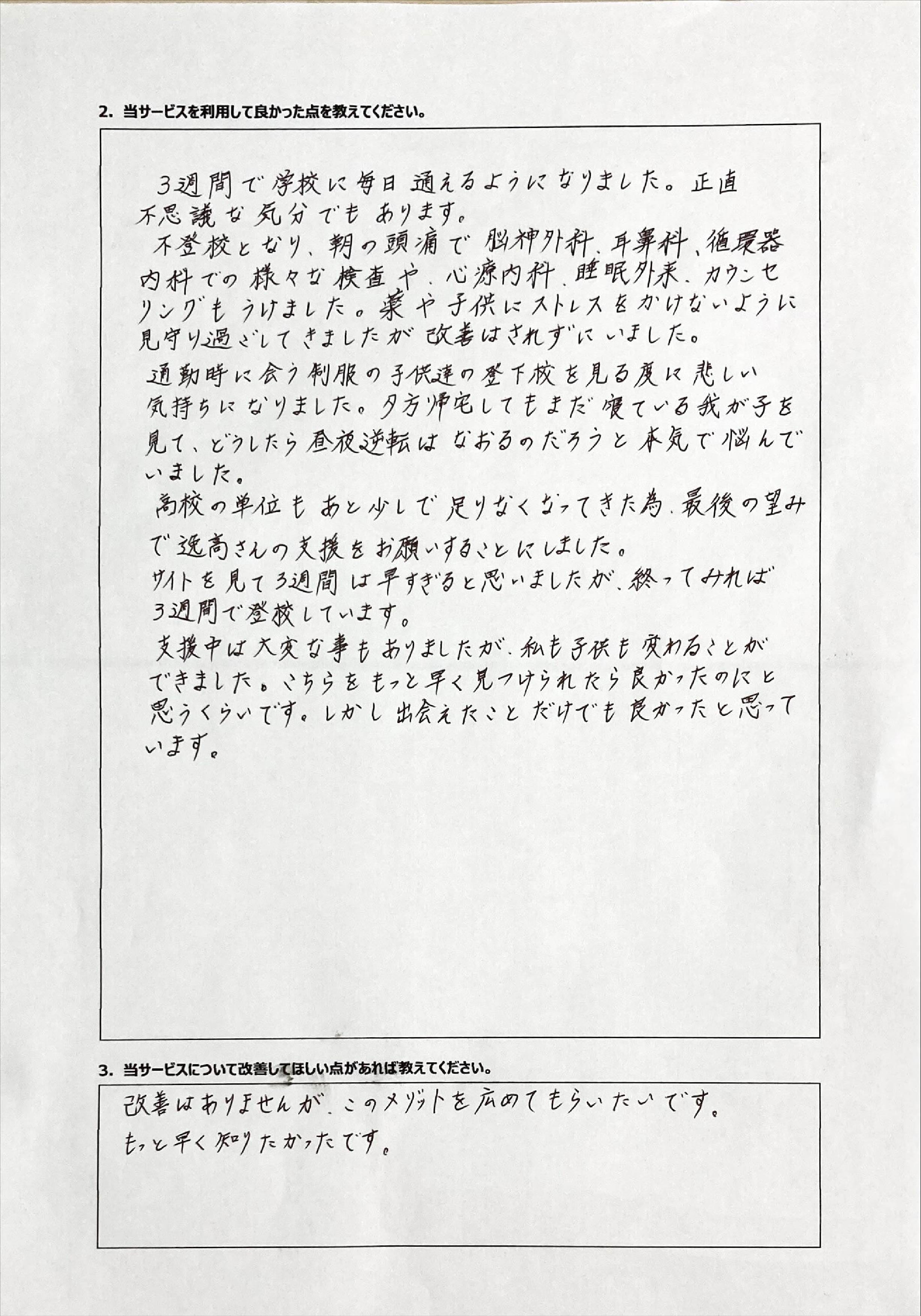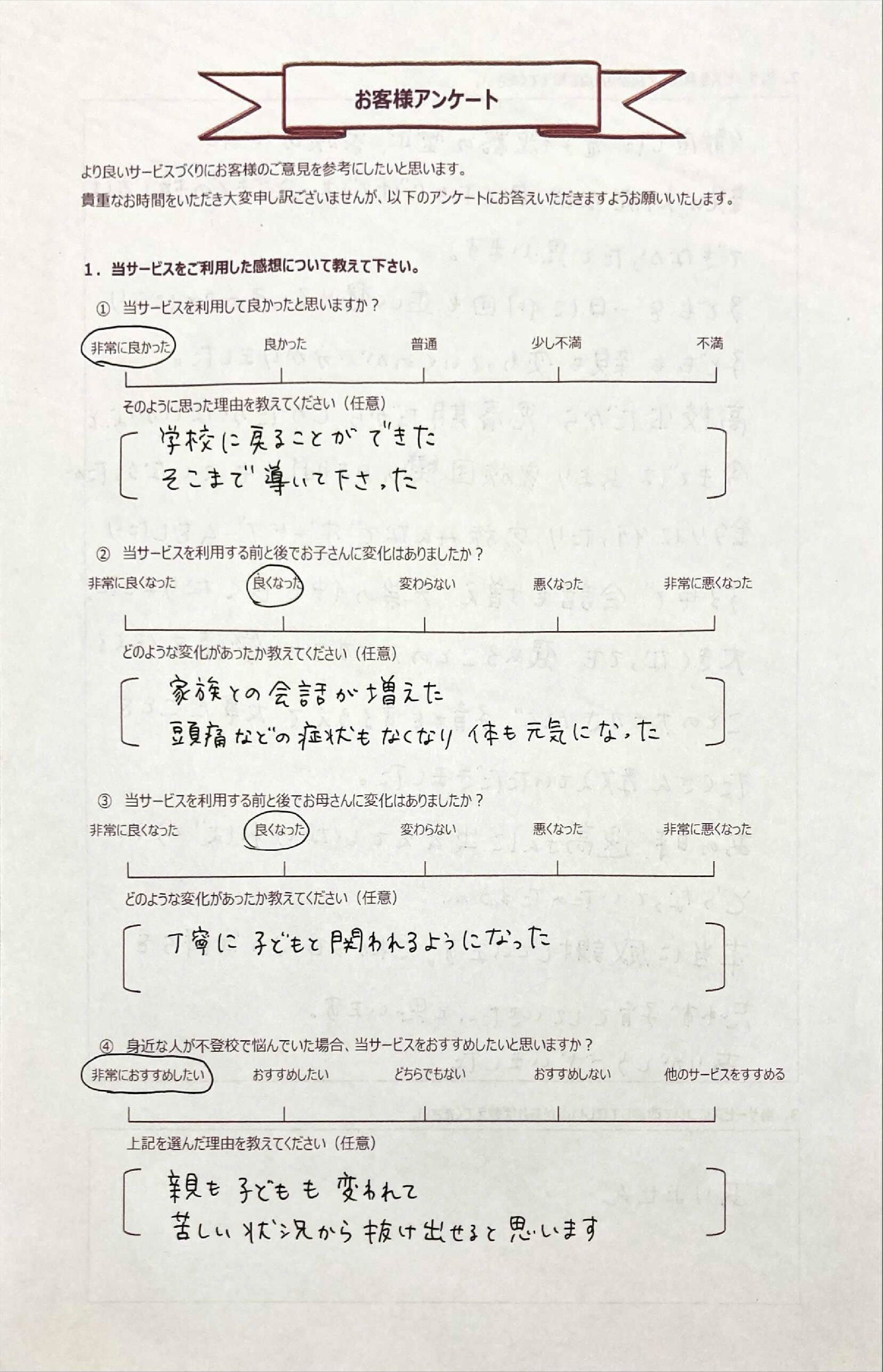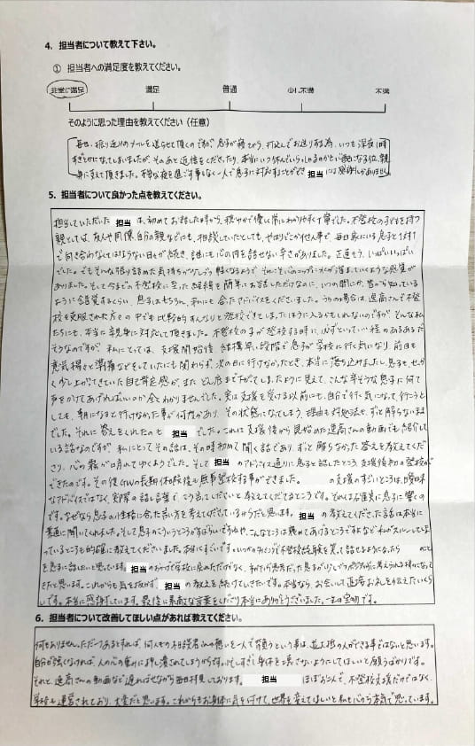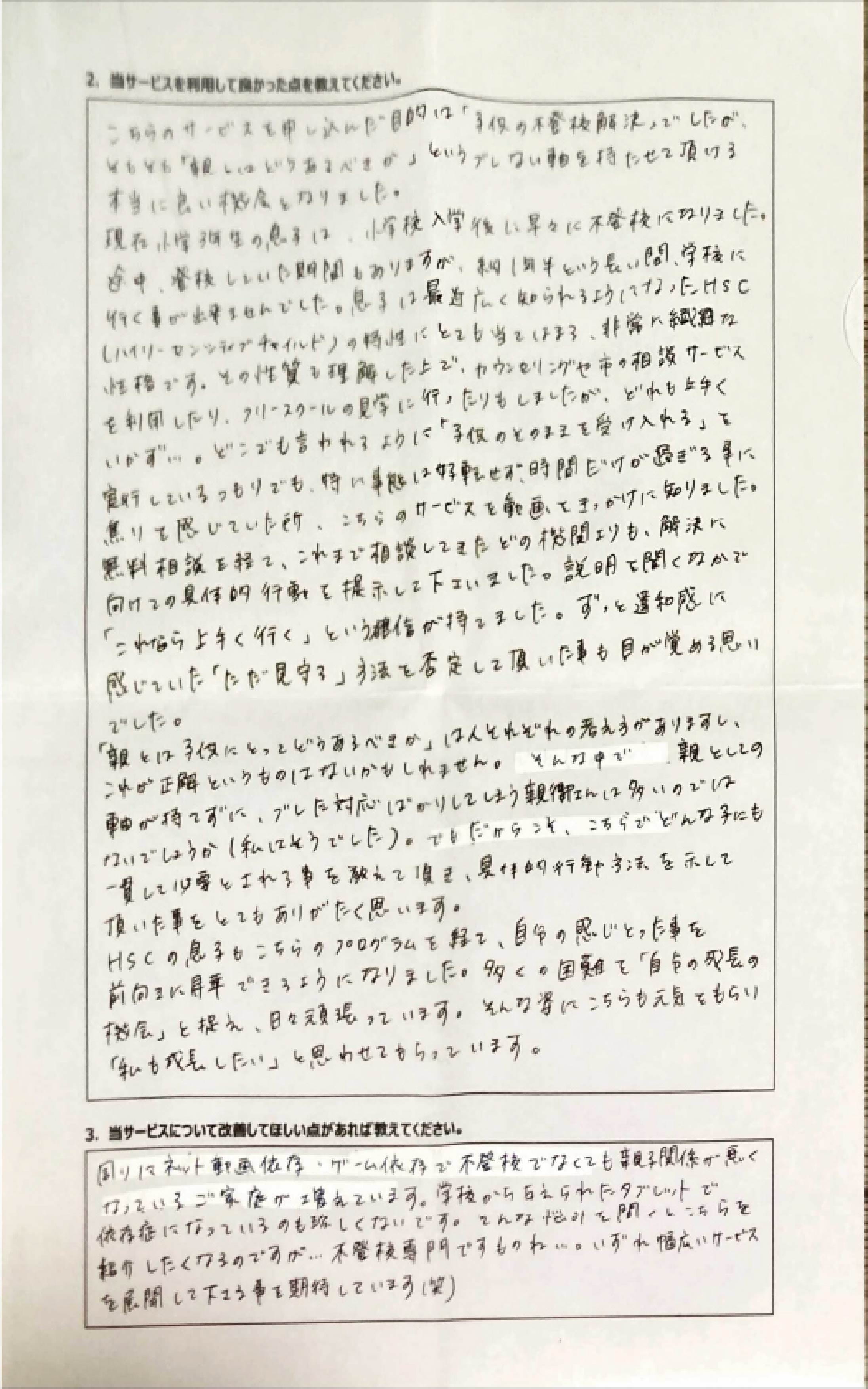とにかく子どもが再登校できたことがすごかったです。そして、どの相談先よりも具体的なアドバイスがこんなにも出てくることが不思議で仕方なかったです。