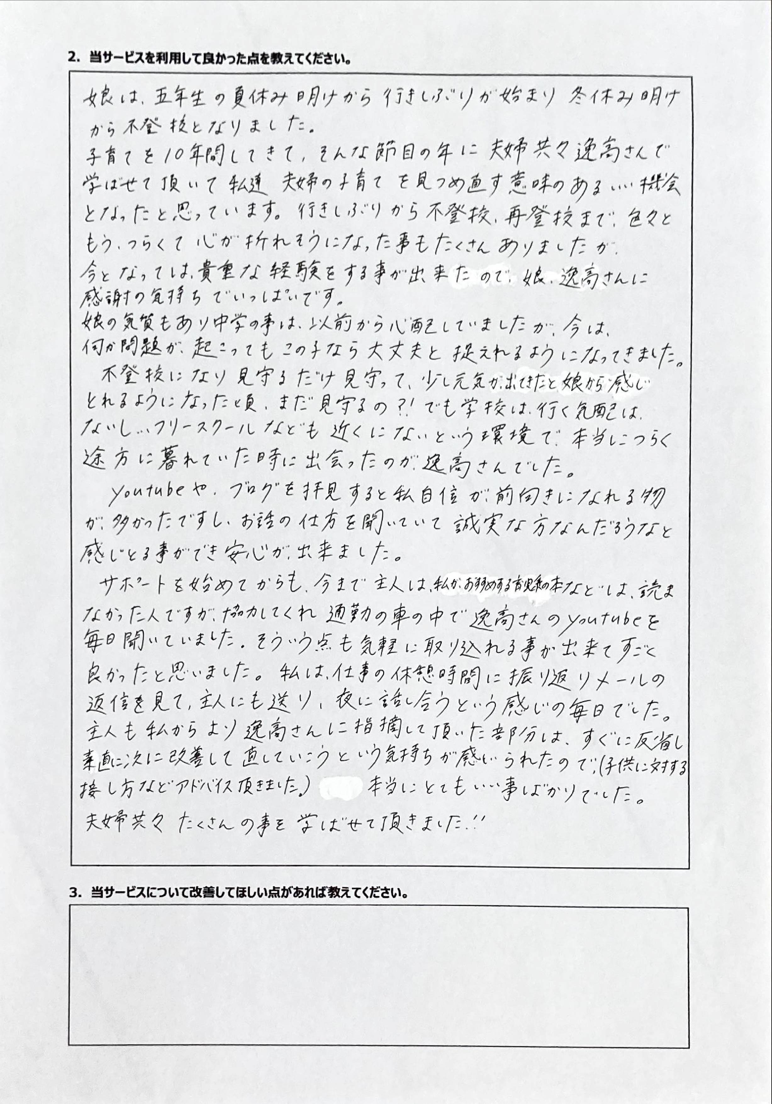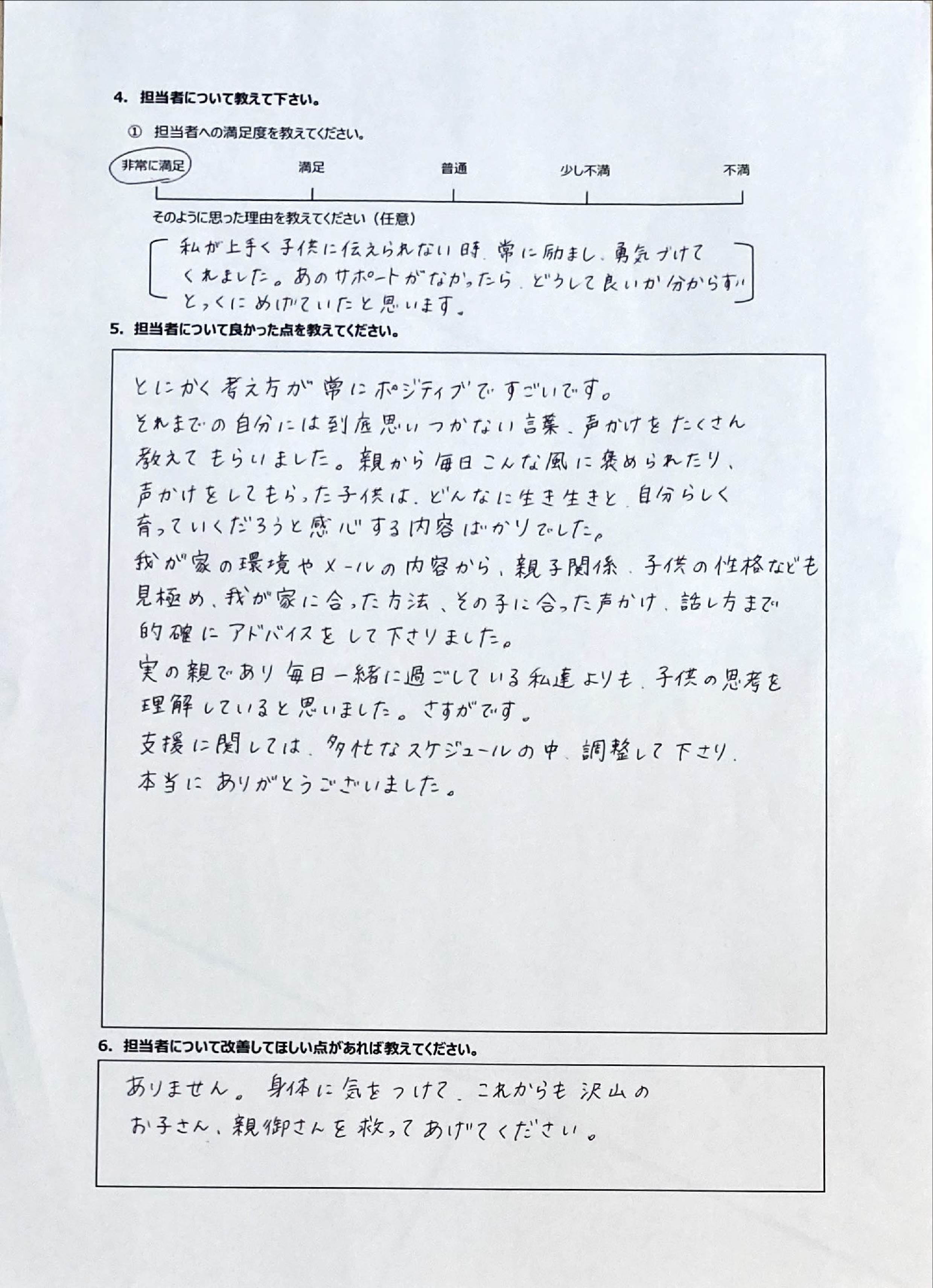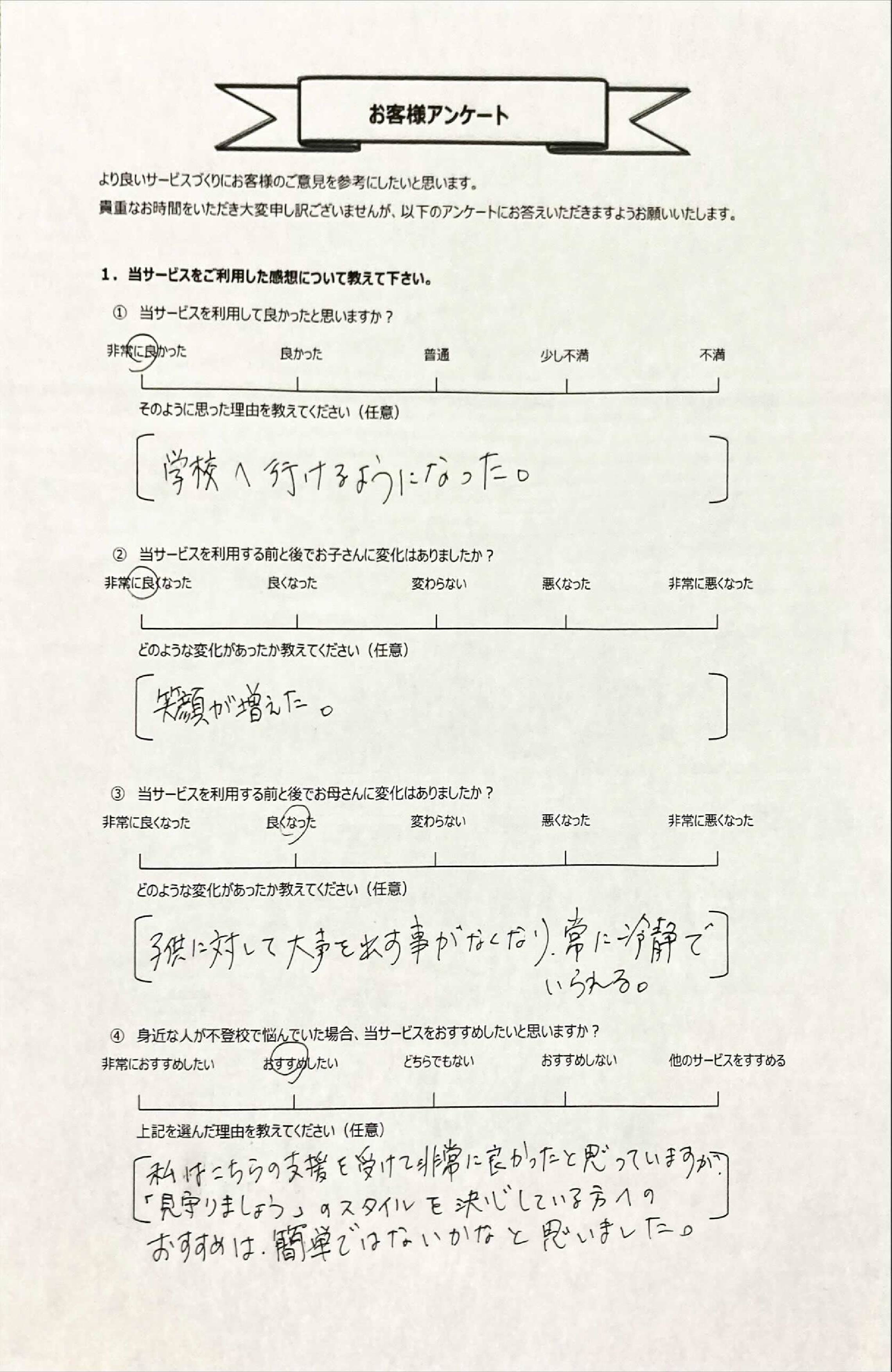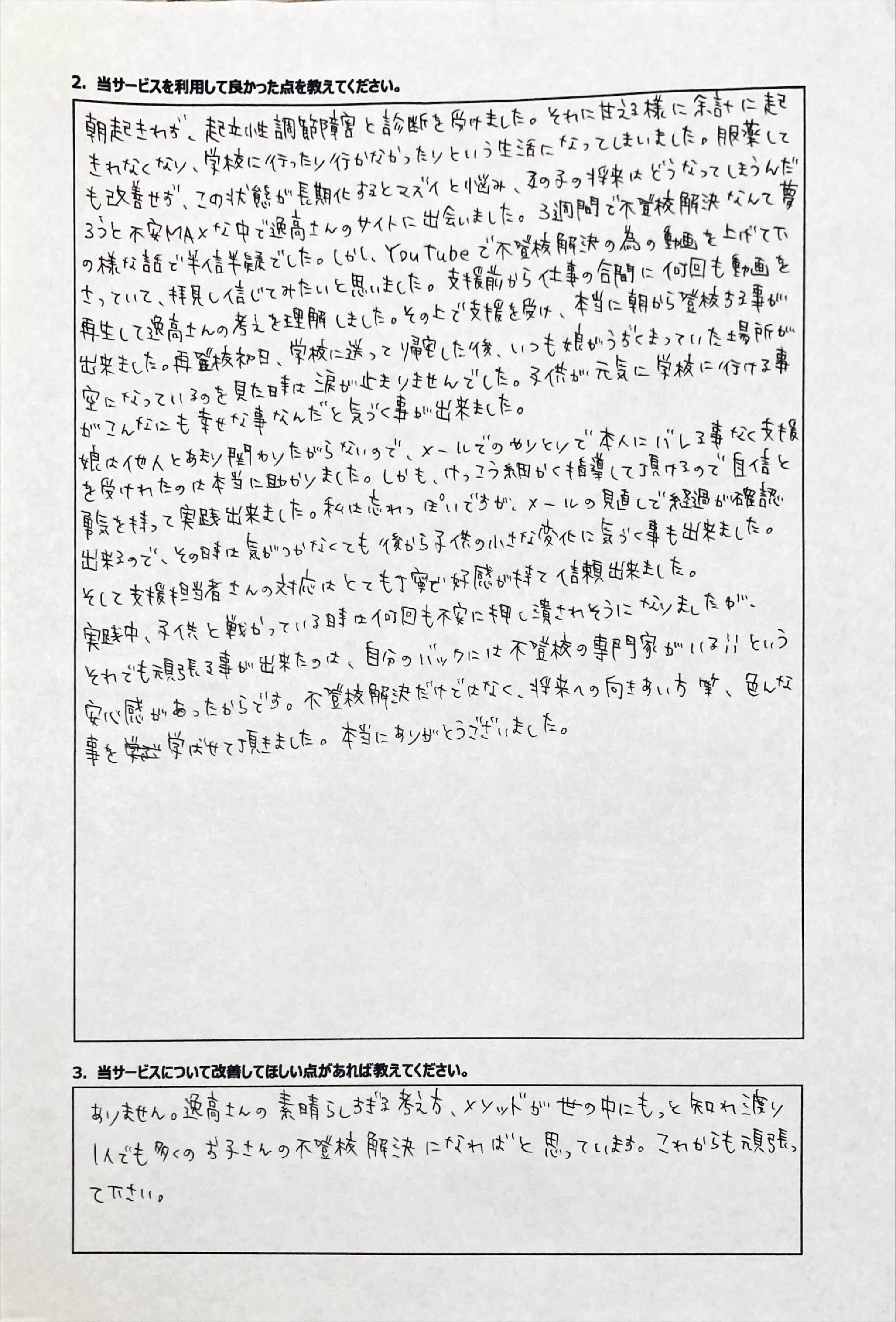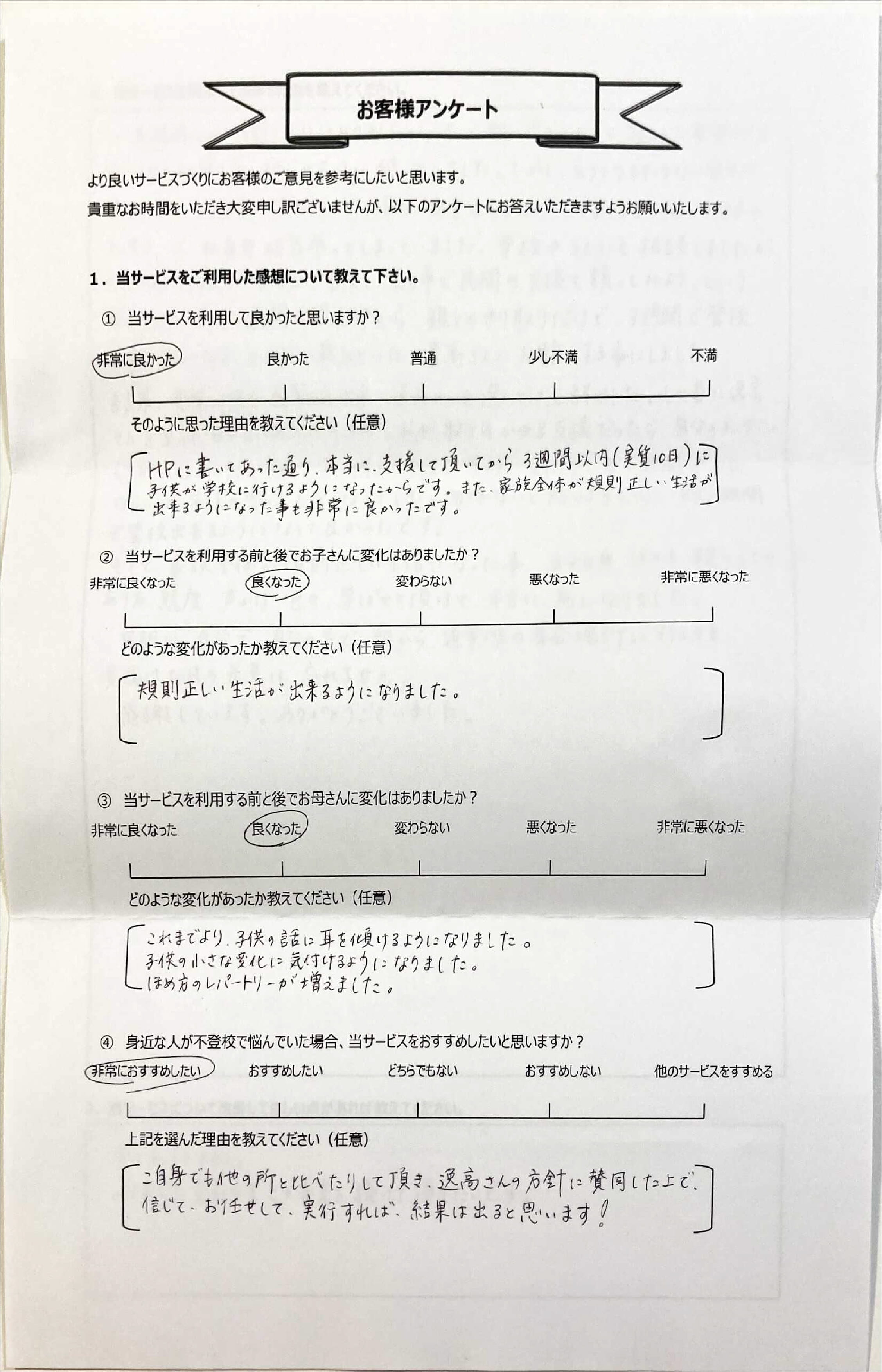とにかく子どもが再登校できたことがすごかったです。そして、どの相談先よりも具体的なアドバイスがこんなにも出てくることが不思議で仕方なかったです。