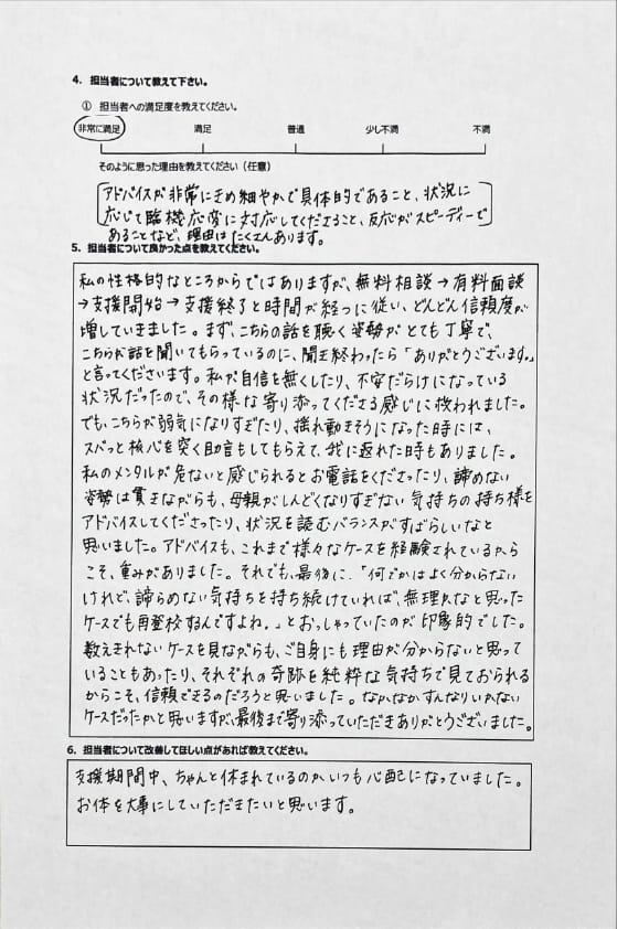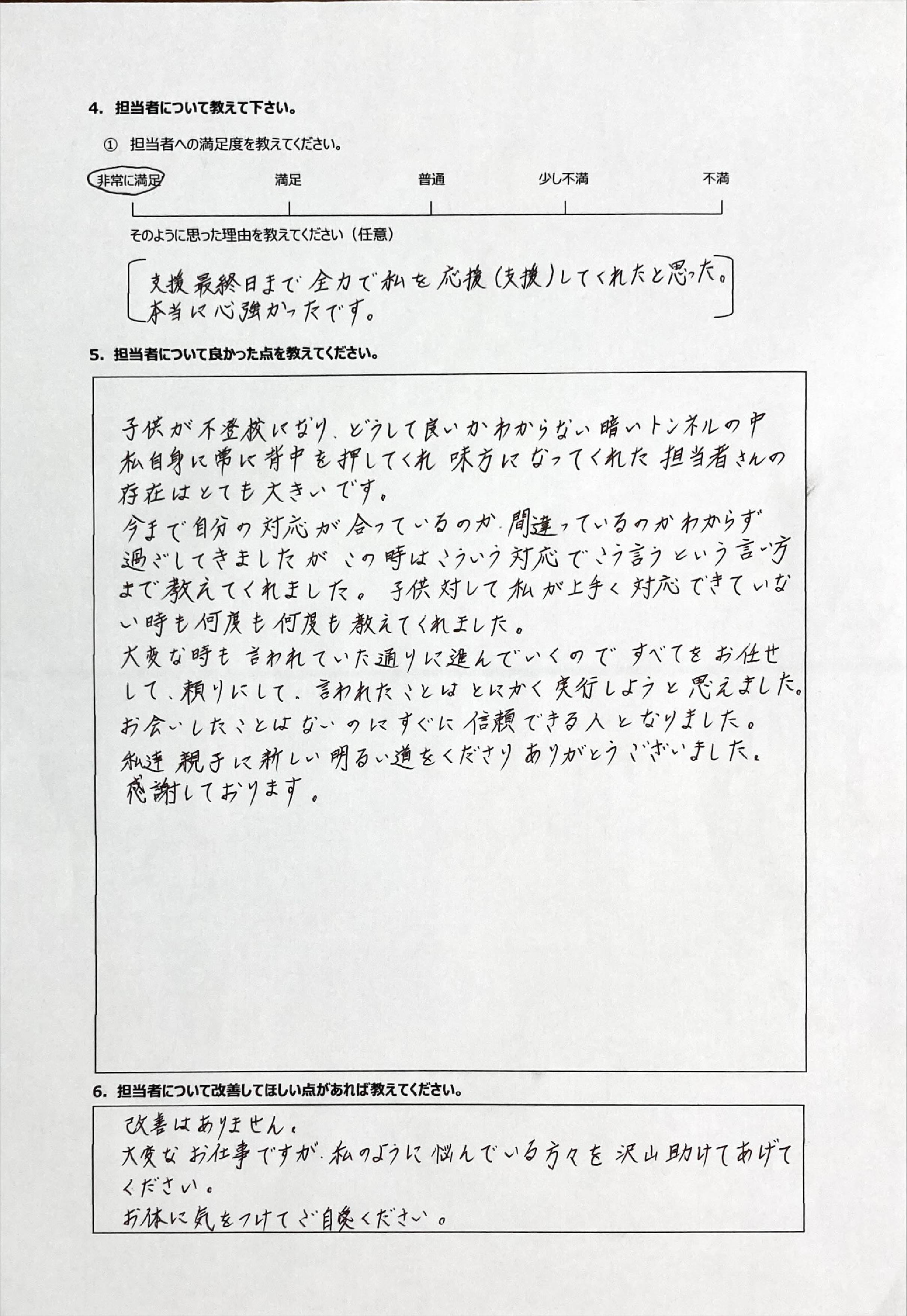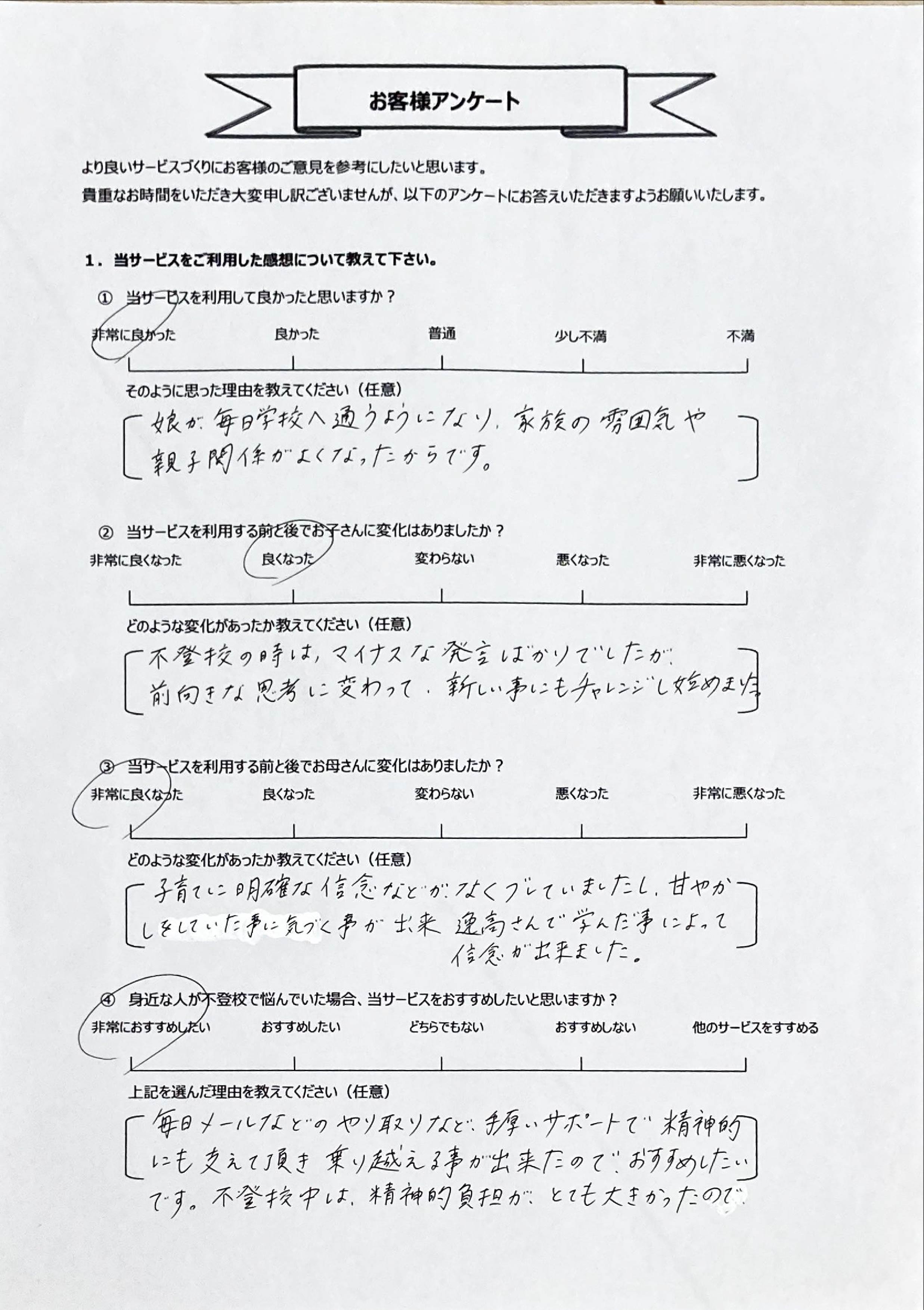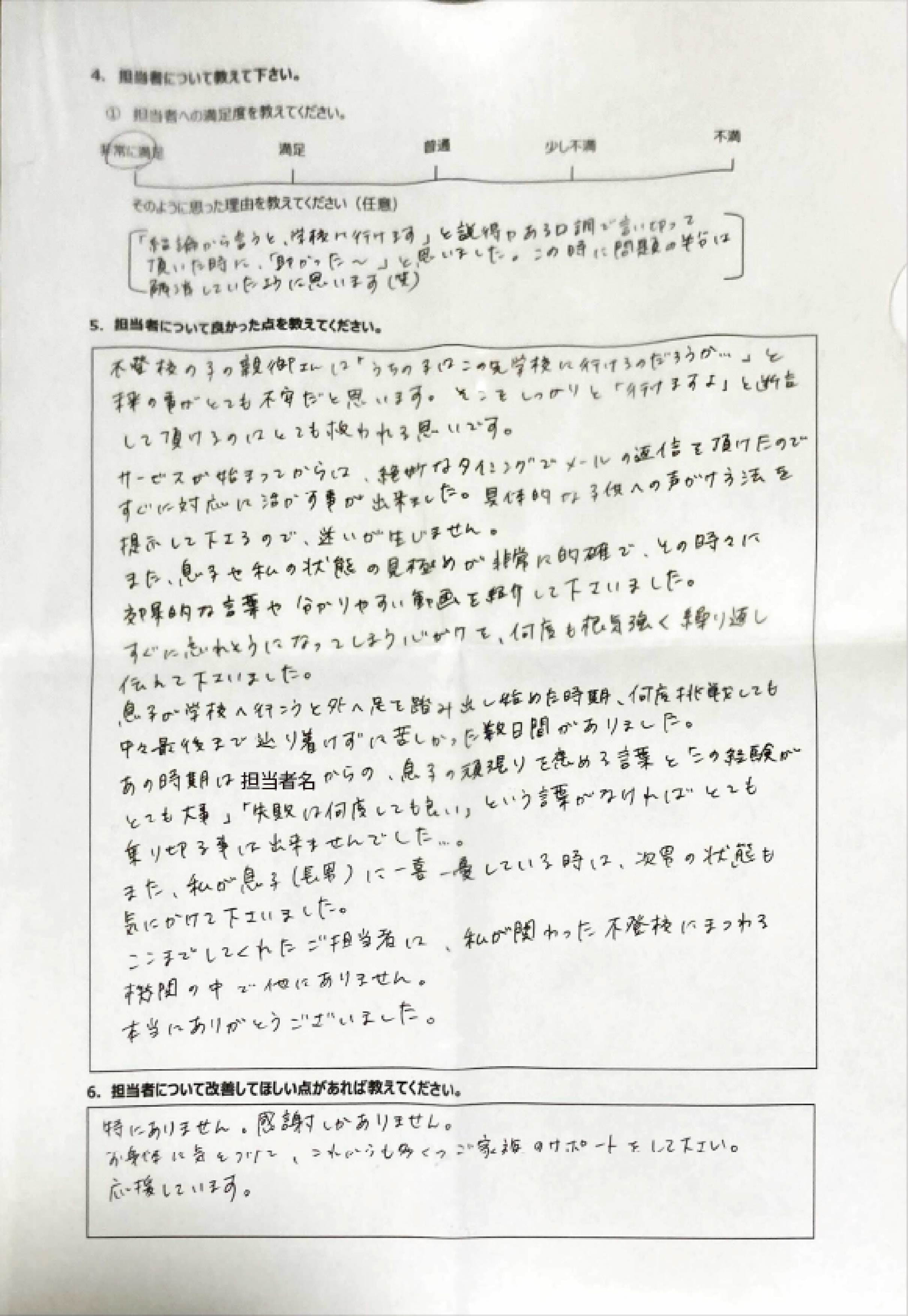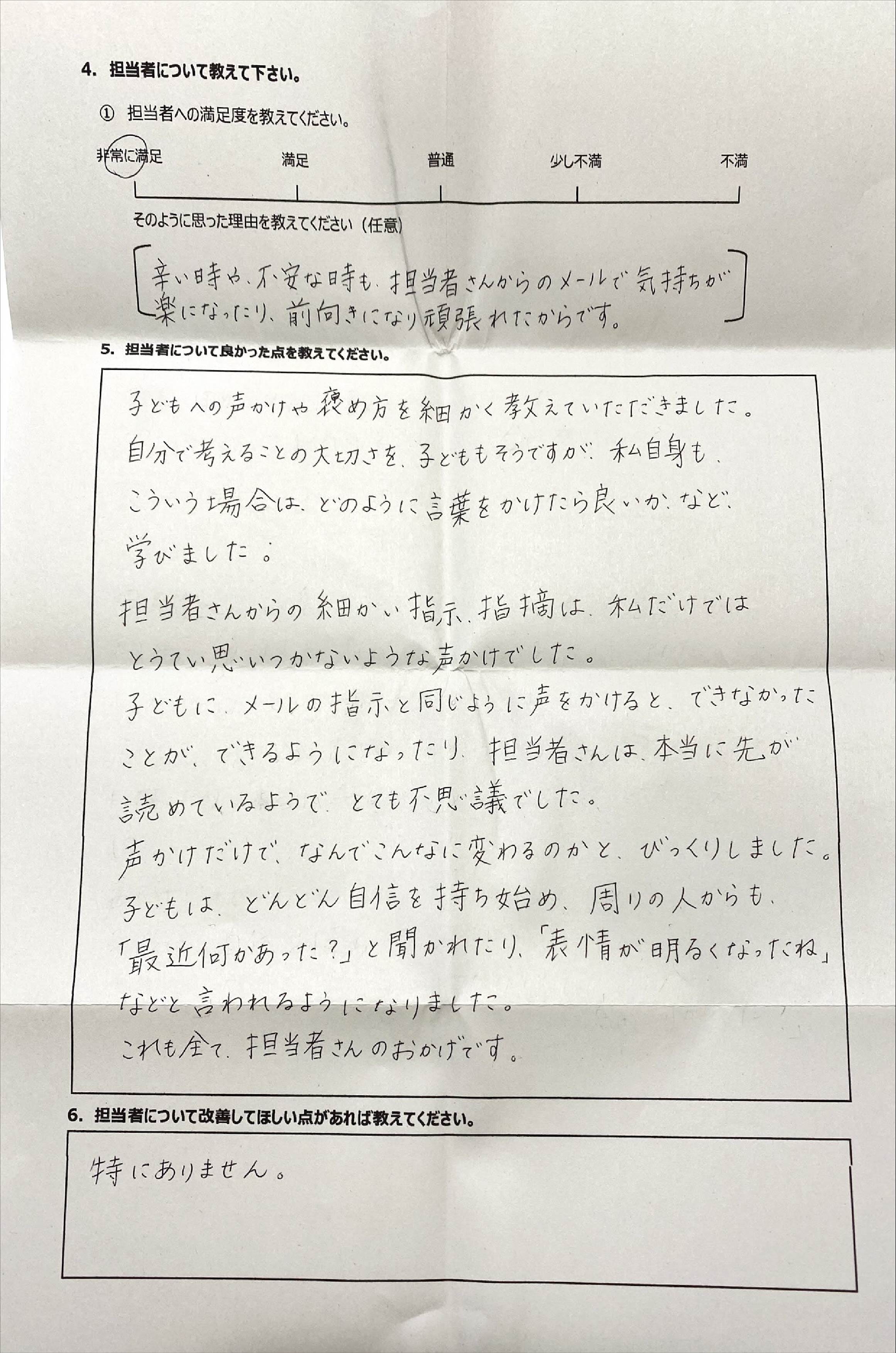 とにかく子どもが再登校できたことがすごかったです。そして、どの相談先よりも具体的なアドバイスがこんなにも出てくることが不思議で仕方なかったです。