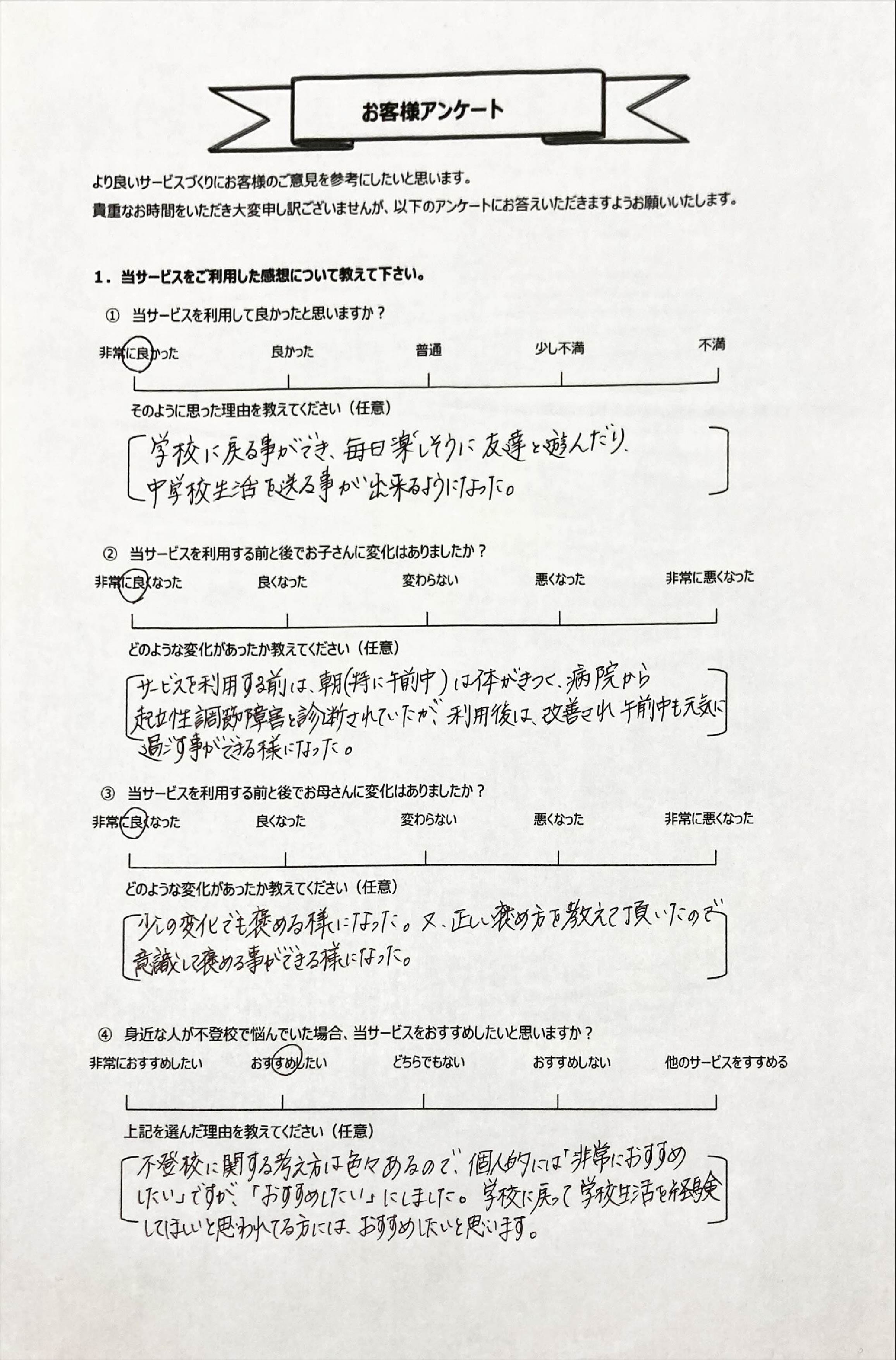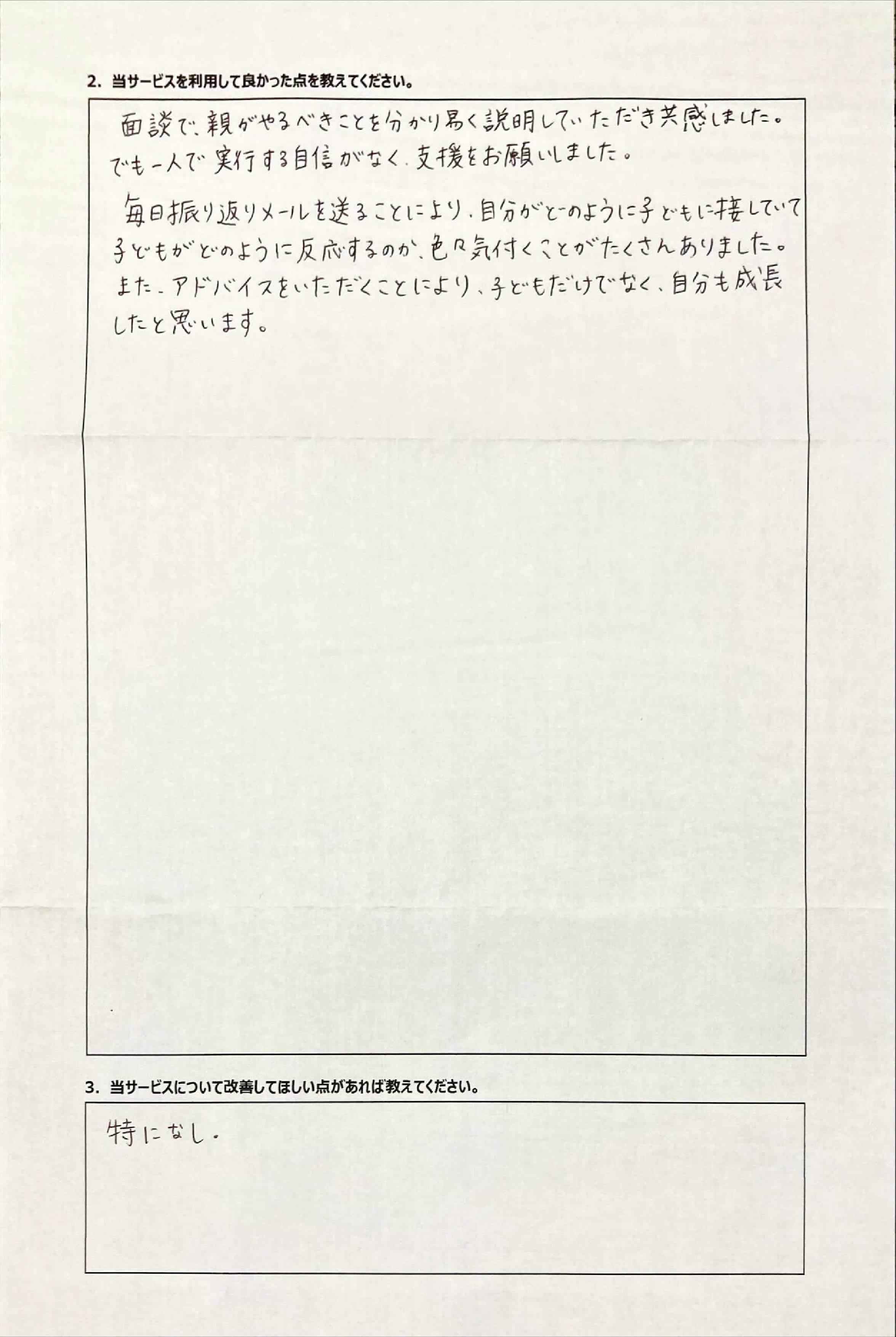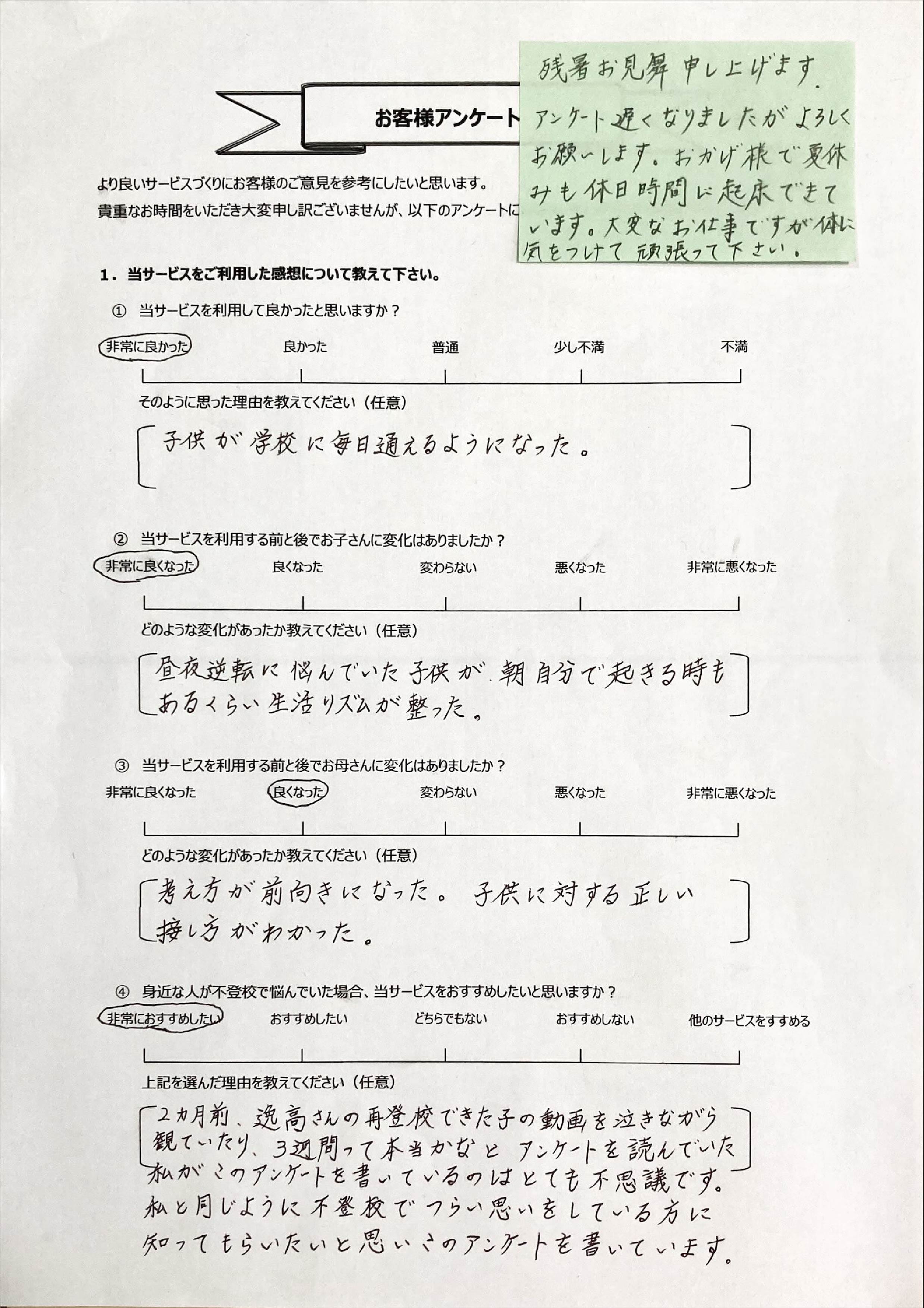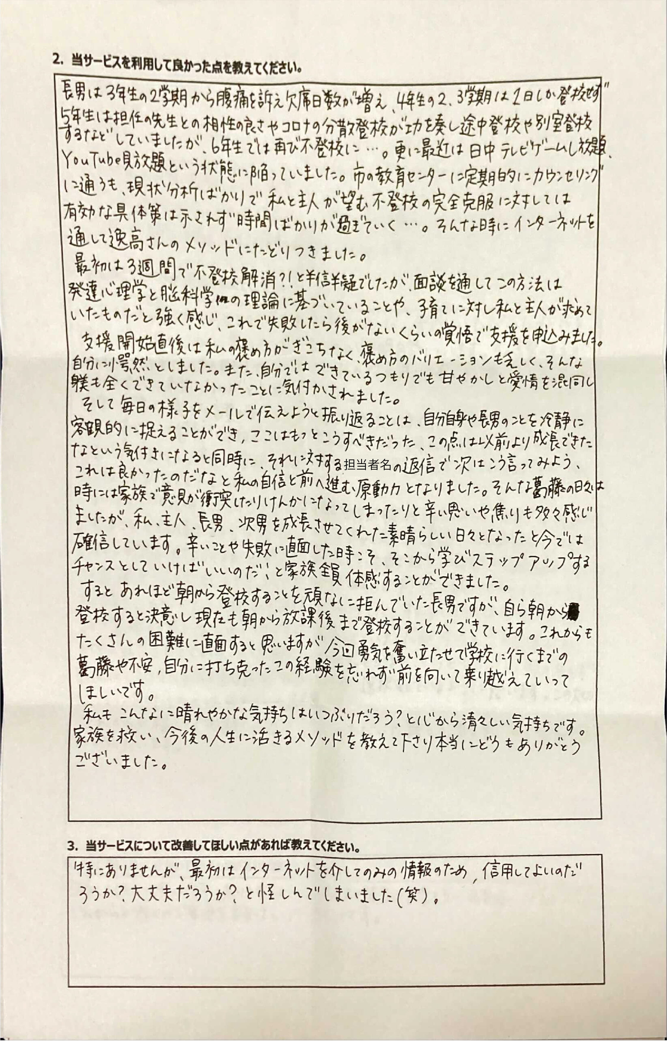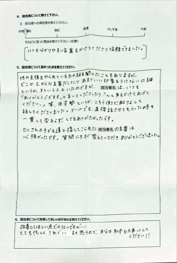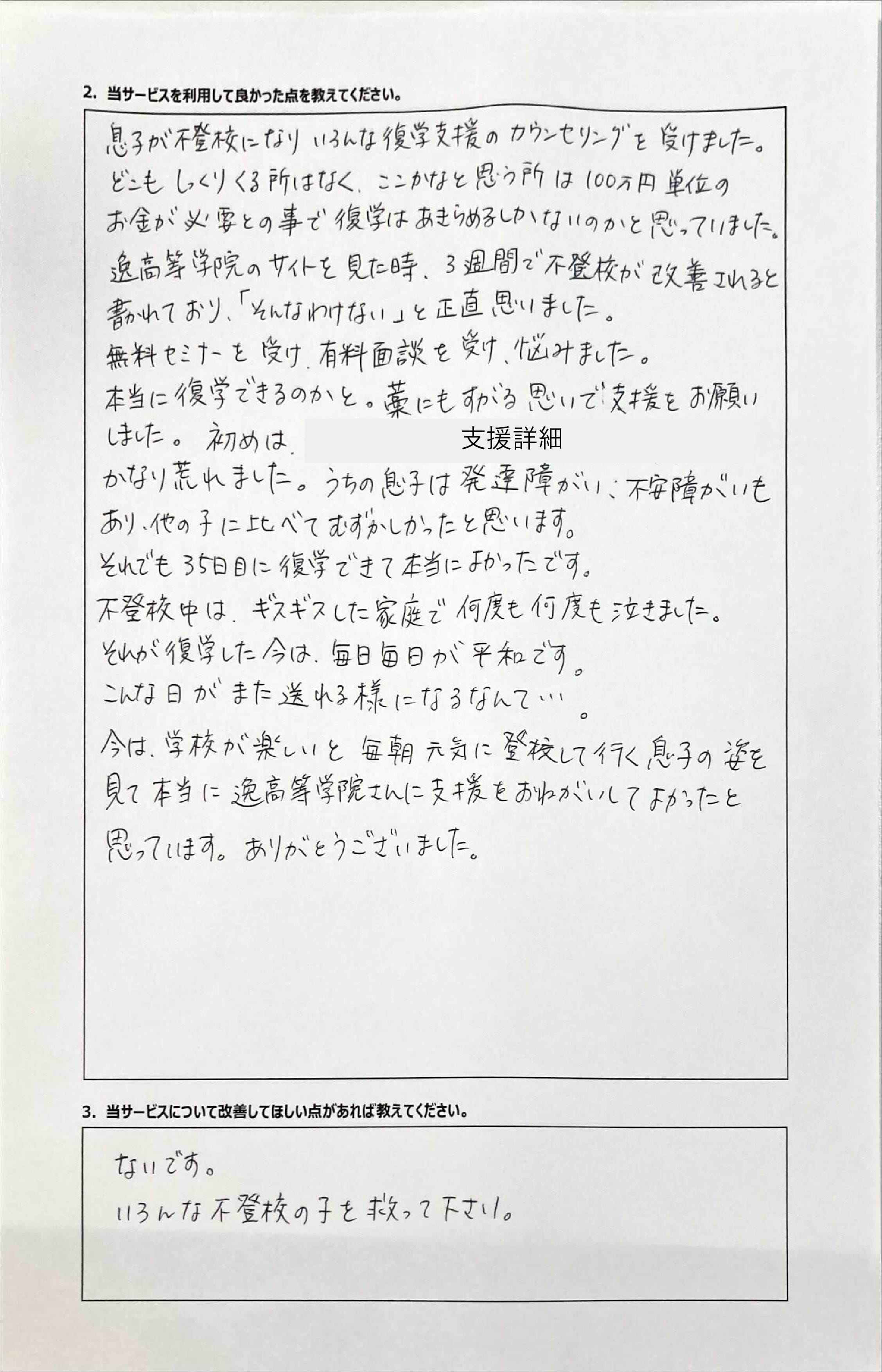 とにかく子どもが再登校できたことがすごかったです。そして、どの相談先よりも具体的なアドバイスがこんなにも出てくることが不思議で仕方なかったです。