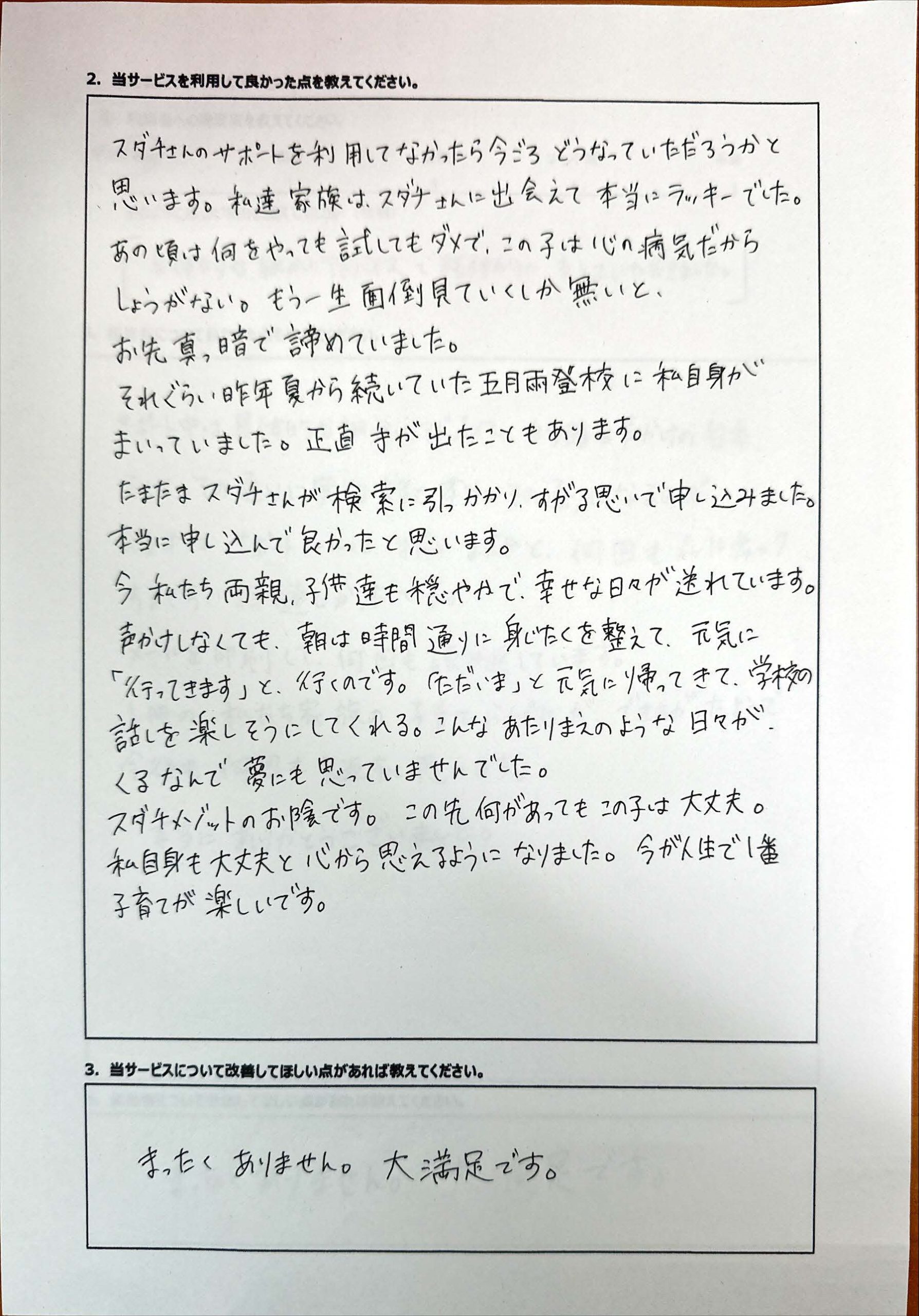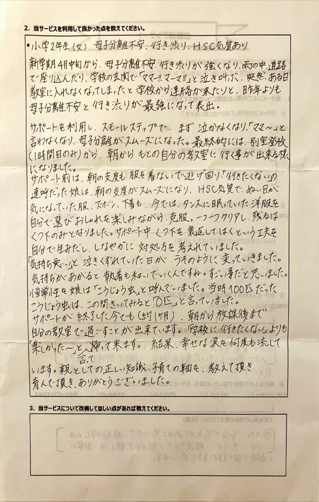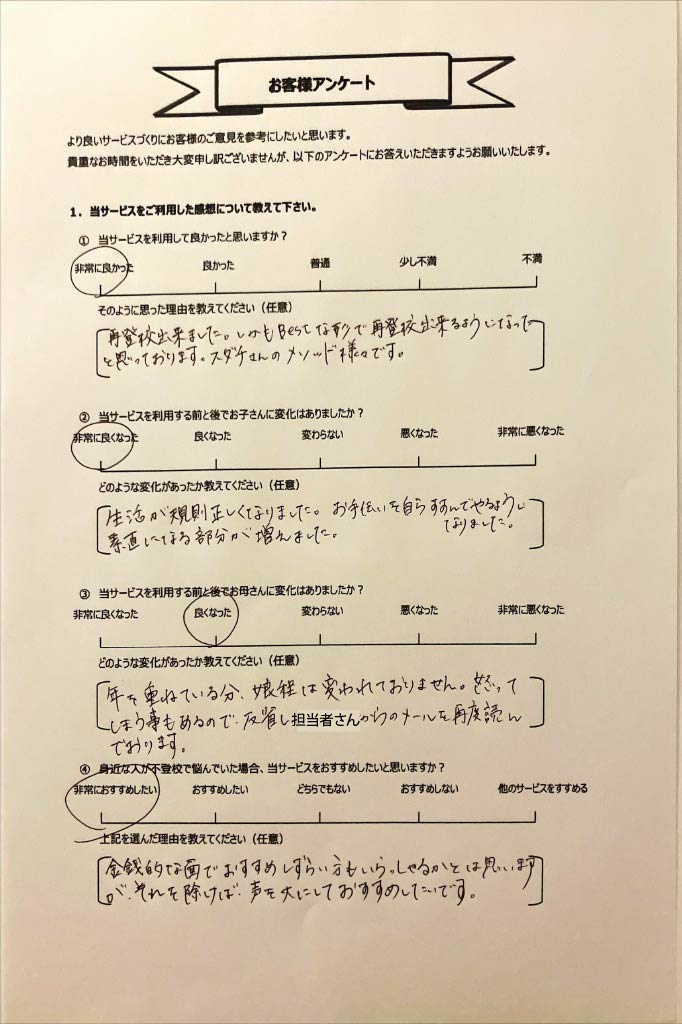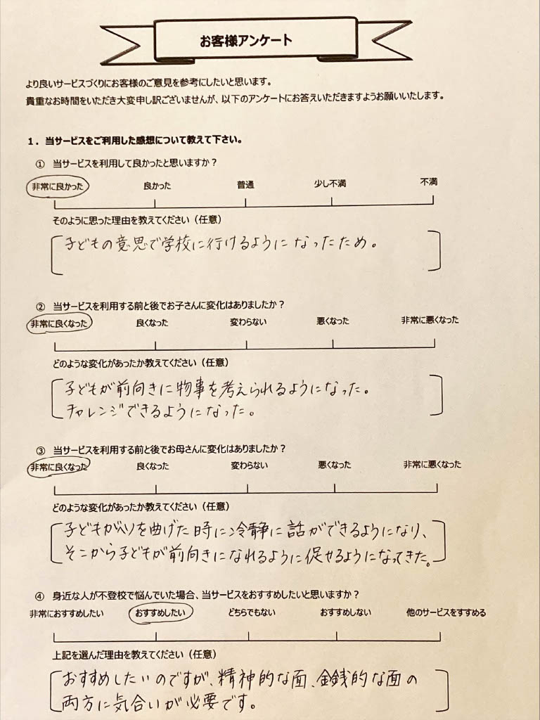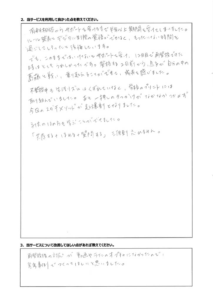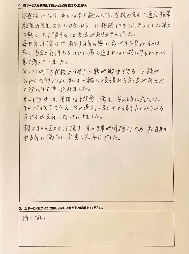 復学支援後の親御さん直筆アンケート