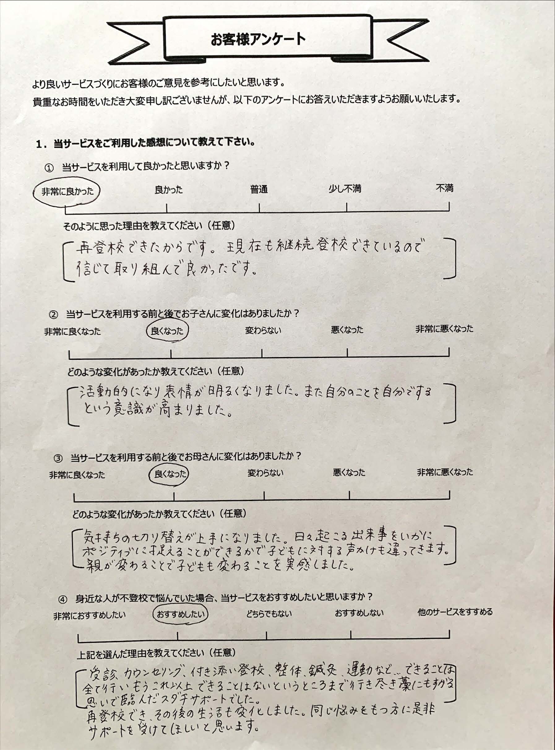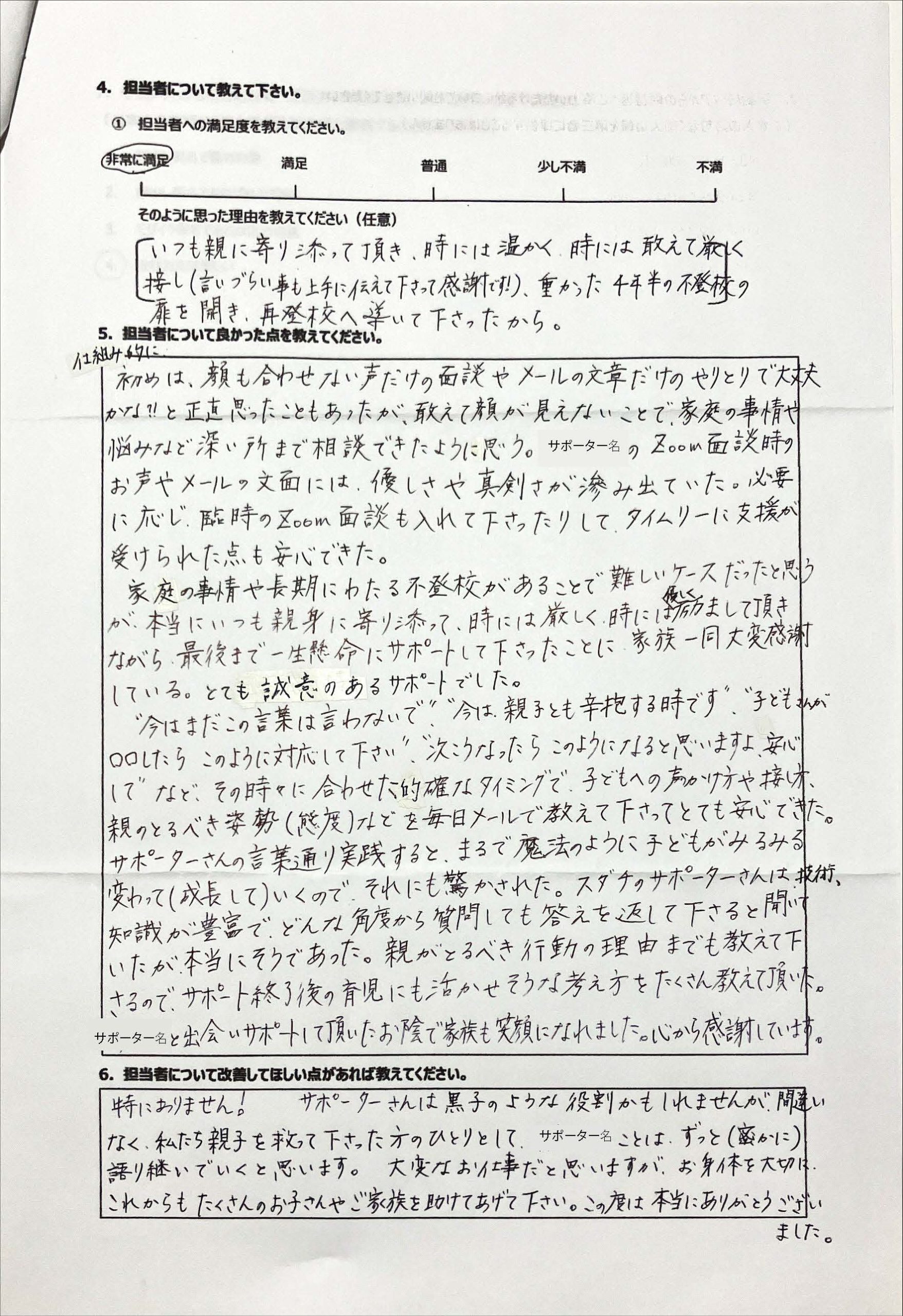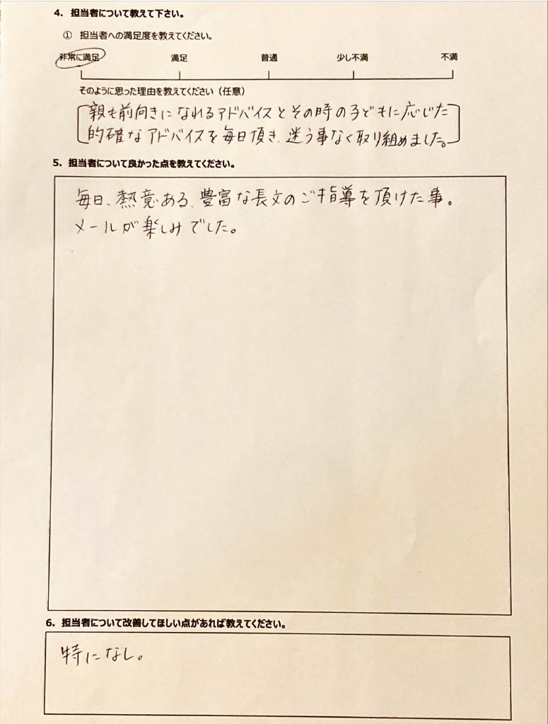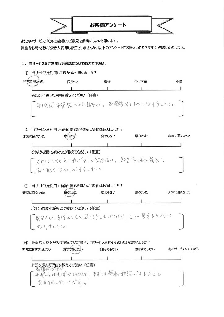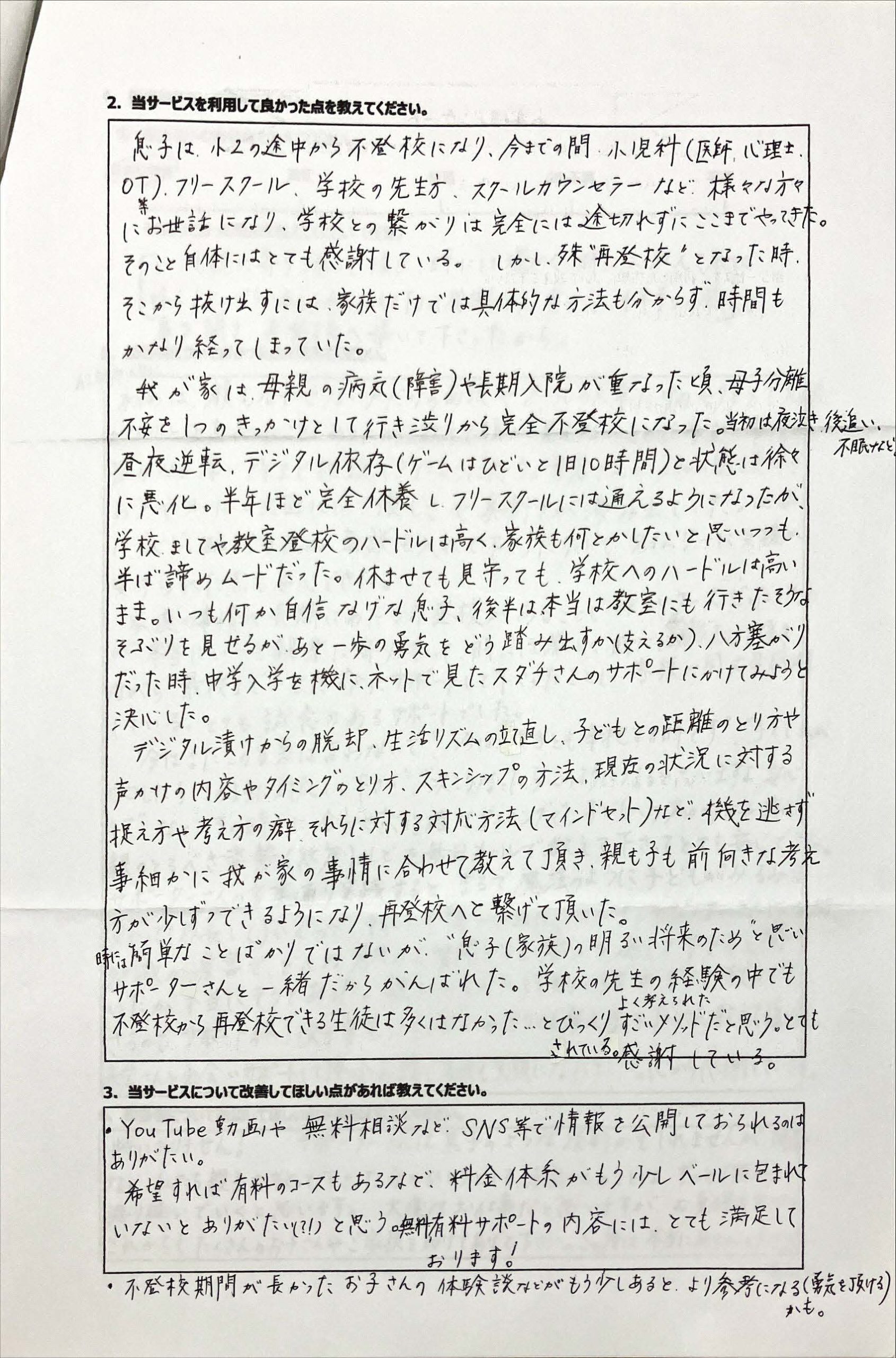 復学支援後の親御さん直筆アンケート