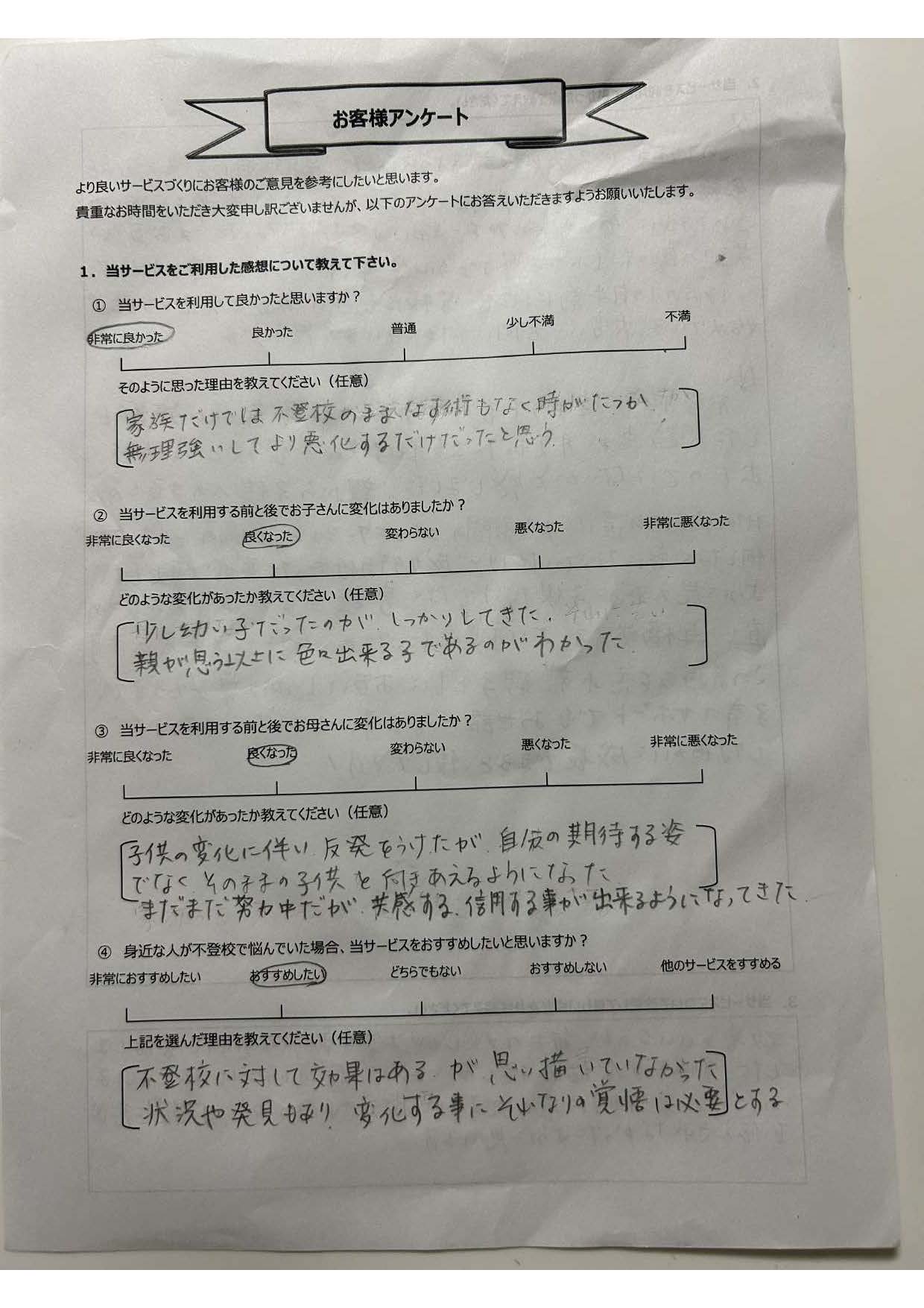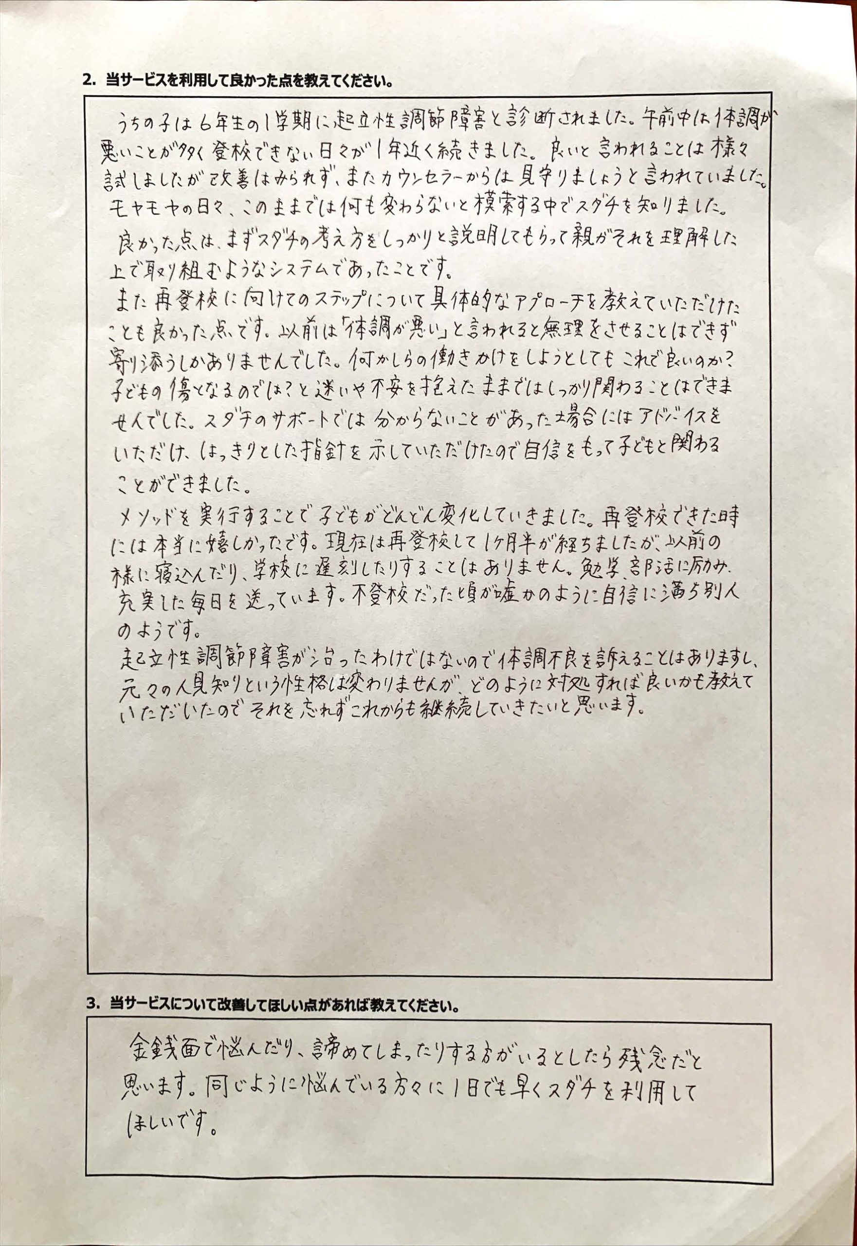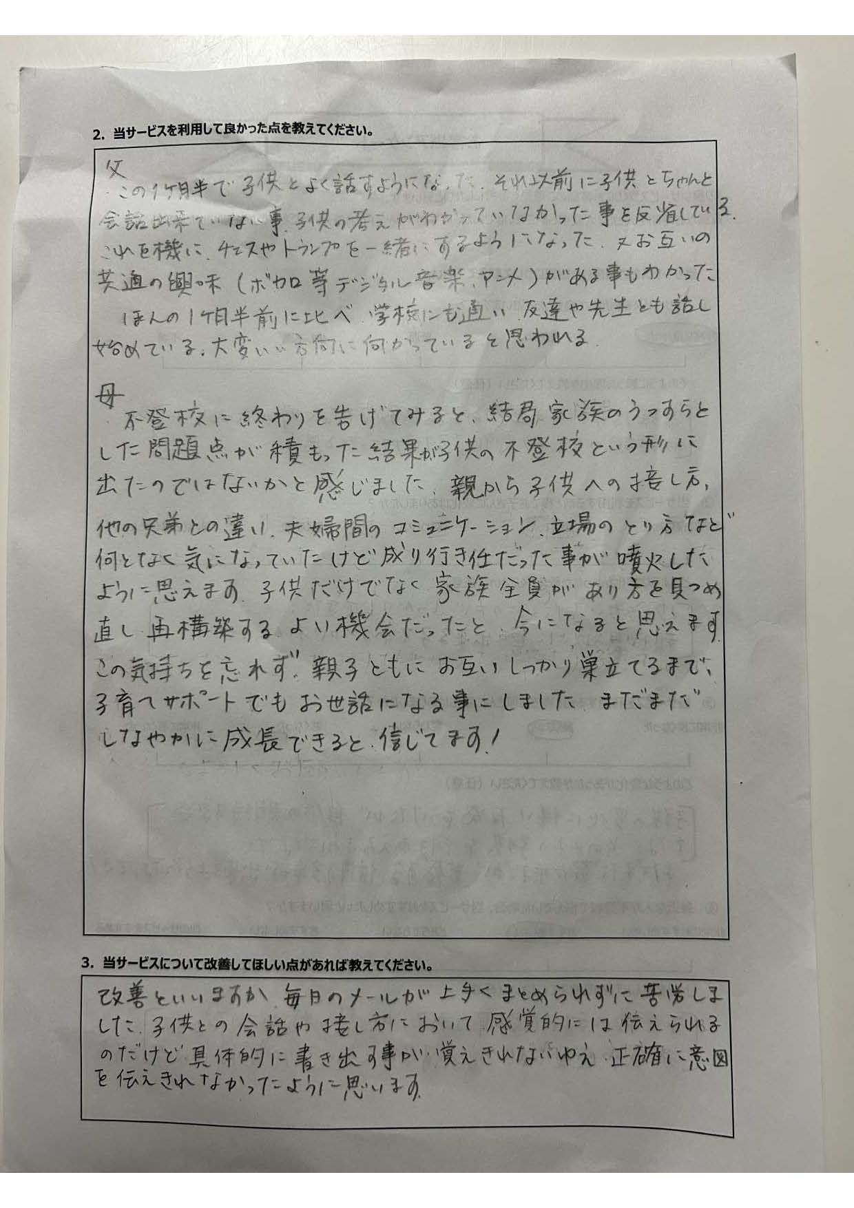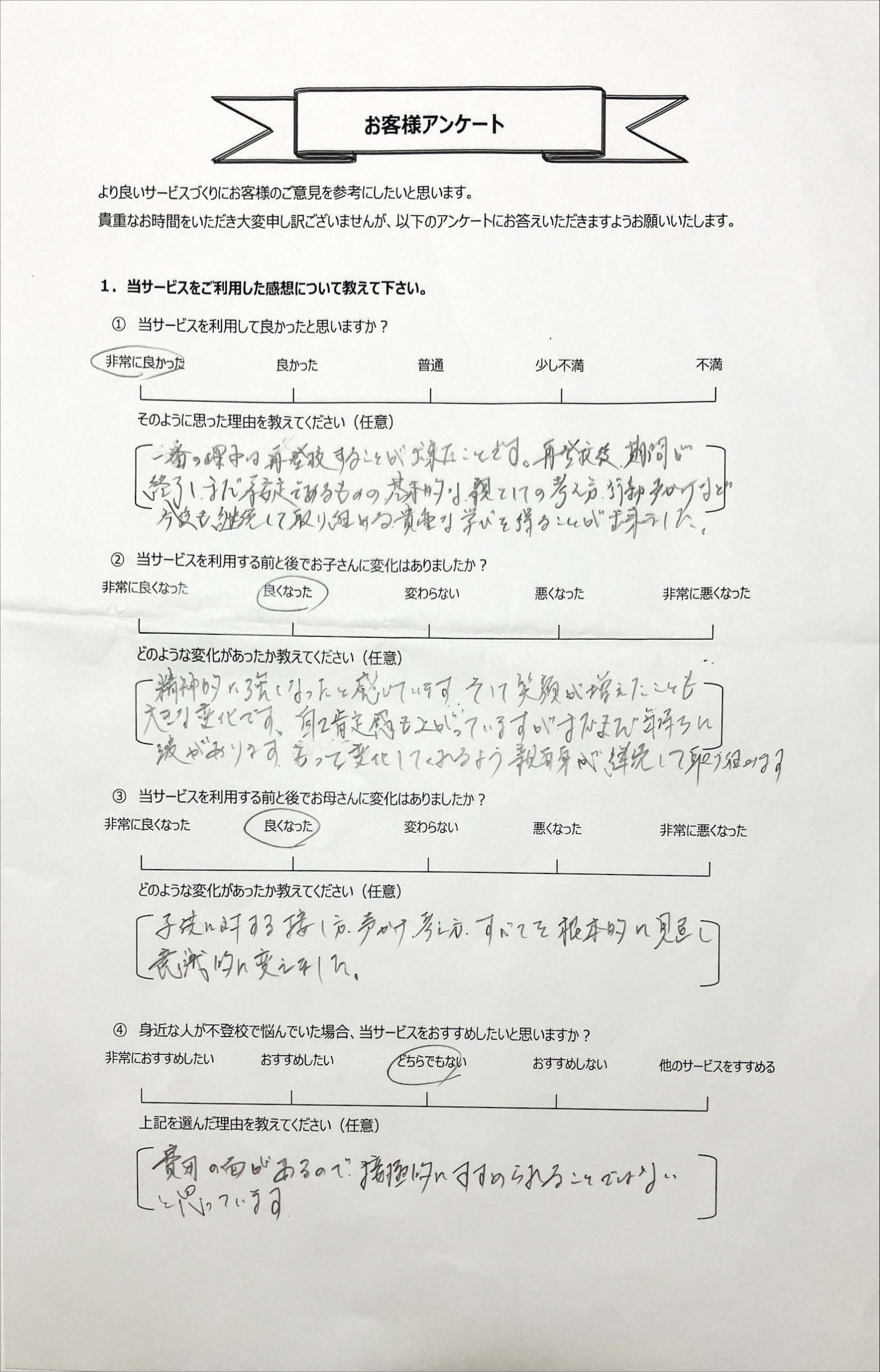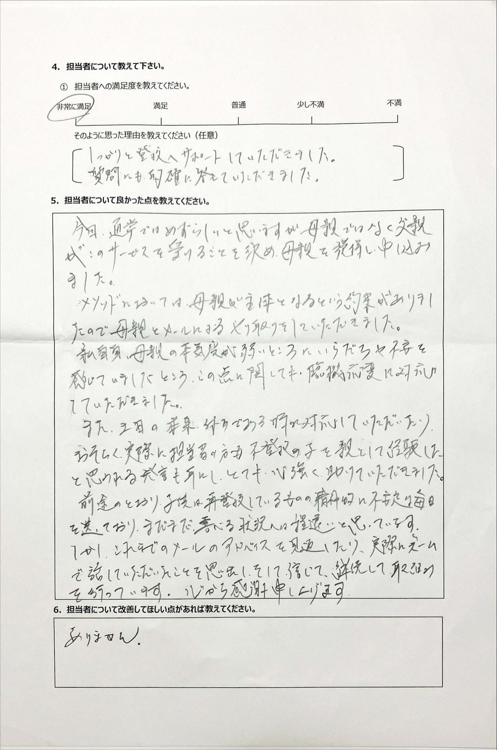 復学支援後の親御さん直筆アンケート