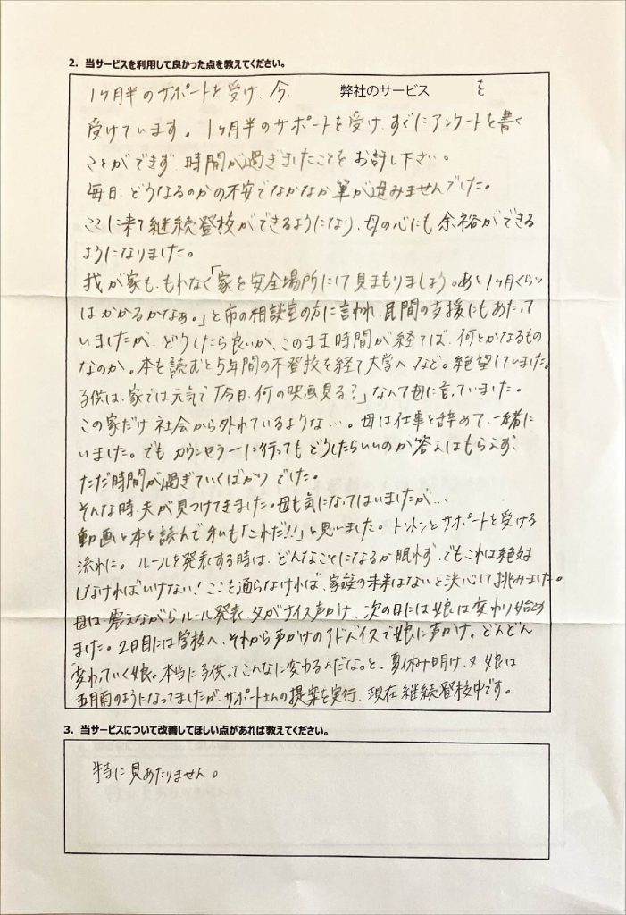 市の相談室の方に「家を安全場所にして見まもりましょう。あと1ヶ月くらいはかかるかなぁ。」と言われ、民間の支援にもあたっていましたが、どうしたら良いか、このまま時間が経てば何とかなるものなのか。絶望していました。子供は家では元気で、「今日、何の映画見る?」なんて母に言っていました。この家だけ社会から外れているような…。母は仕事を辞めて一緒にいました。でもカウンセラーに行っても答えはもらえず、ただ時間が過ぎていくばかりでした。 そんな時、夫が見つけてきました。動画と本を読んで私も「これだ!!」と思いました。トントンとサポートを受ける流れに。ルールを発表する時は眠れず、でもこれは絶対しなければいけない! ここを通らなければ家族の未来はないと決心して挑みました。母は震えながらルール発表、父がナイス声かけ、次の日には娘は変わり始めました。2日目には学校へ。 それから声かけのアドバイスで娘に声かけ。どんどん変わっていく娘。本当に子供ってこんなに変わるんだなっと。夏休み明け、娘は五月雨のようになってましたが、サポーターさんの提案を実行、現在継続登校中です。メールで頂いたアドバイスを娘に実行すると、みるみる変わっていきました。毎回頂いたメールを読むたびに、すごい!!と思いました。感動でした。涙が出ました。 金額を聞いて驚きましたが、我が家はやるしかない!!でサポートを受けることにしました。読んでいく内にそれだけの価値がある! いや、もうお金の問題ではないと思いました。主人とは、不登校の人は絶対サポートを受けるべきだと記しています。1人の人生がかかっているので、もう何にも代えられないものだと思います。