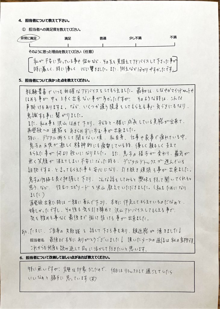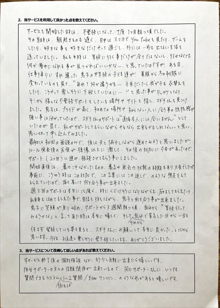 2ヶ月前は、このまま学校に行けない状態が続くかもしれない…と不安でしたが、サポートを受けた事が大きなキッカケとなり、無事に再登校する事が出来ました。家の中で笑顔が増え、会話も多くなり、不安な事や分からない事への拒絶反応も減り、「とりあえずやってみよう」という姿勢に変わりました。 不登校になって1ヶ月ほど経った頃、息子は朝起きるのも遅く、YouTubeやゲームばかりの生活で、一歩も外に出ませんでした。私も当時は「行かなくてもいいかな」と思っていましたが、学校の子達の制服が冬服に変わっているのを見て、「あれ?何か違うかも…」と思い、スダチさんを探し当てました。直接会わずにサポートしてもらえるところも良く、思い切って申し込みました。 開始直後は暴言や無気力の時期もあり大変でしたが、その都度「こういう時はこの対応で」と想定してもらえていたので、落ち着いて向き合えました。週3回のサポートは本当に心強く、励ましや私自身をほめてもらえた事で、自信を持てました。3週間ほど経つ頃、息子から「学校行ってみようかな」と言われた時は、本当に嬉しかったです。その日から一日も休まず登校し、今では友達と楽しそうに登下校しています。 経験豊富で的確なアドバイスをいただき、声掛けの提案も分かりやすく、デジタル断ちで反発が強かった時も精神的に支えて頂きました。息子の性格を踏まえたエピソードも役立ち、再登校時には一緒に喜んで下さいました。最後まで伴走して頂き、頂いたメールは私の宝物です。