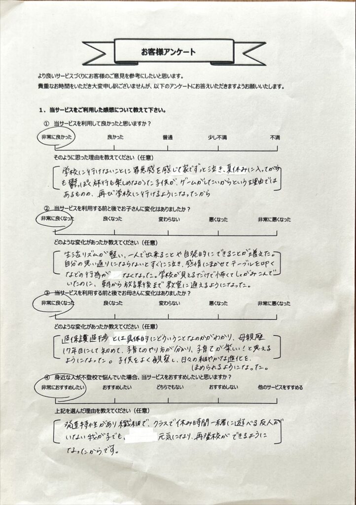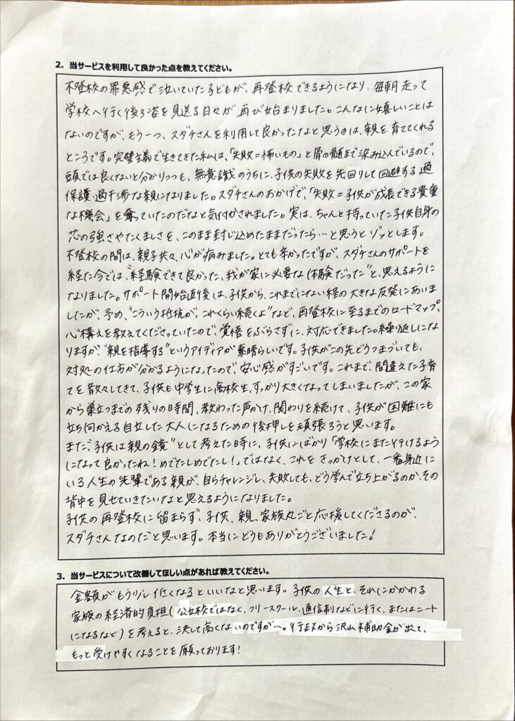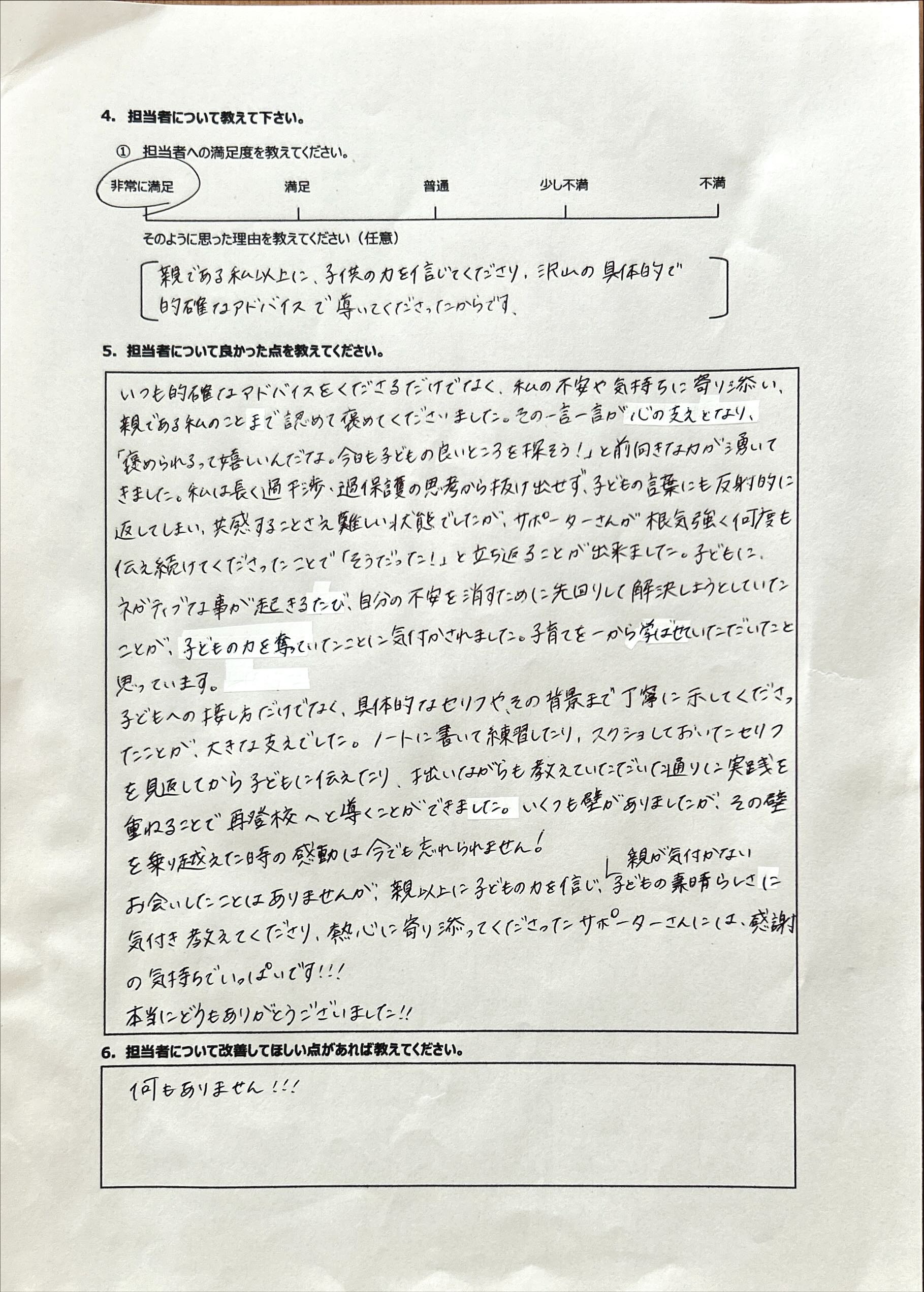 アンケートへのご協力、誠にありがとうございました!日々のお子さんとの関わり合いのなかで、迷うこともあったかと思いますが、スダチを信じていただけたからこそ、再登校を果たすことができています。親御さんの日々の実践の賜物です。感謝申し上げます。ノートに書いて練習したり、日々いつでも見返せるようにするという工夫がお子さんの変化を生むことに繋がっております。これからも、お子さんのことを信じて、温かくも時には厳しく愛情をもって見守ってあげて下さい。この度は本当にありがとうございました!